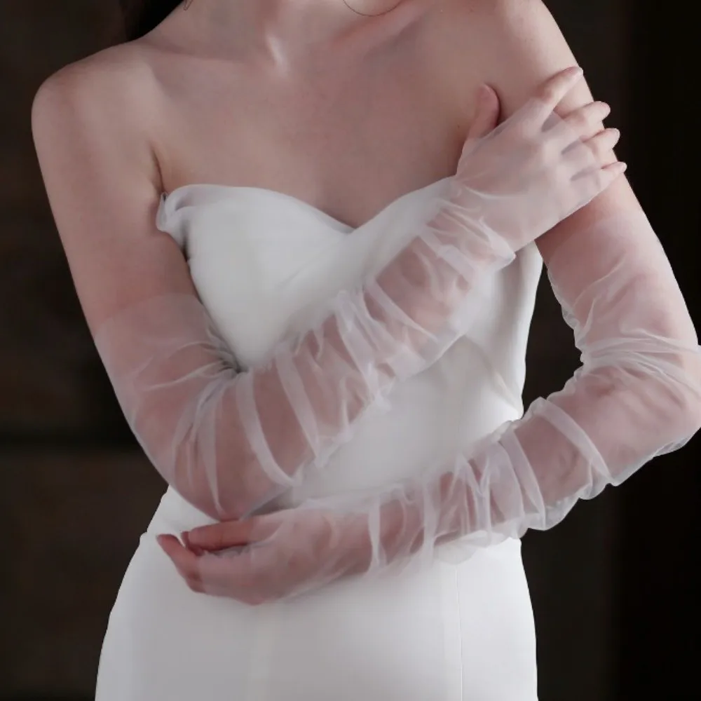 Элегантные длинные свадебные перчатки до локтя с жемчугом и бисером для свадебной вечеринки, тюлевые перчатки на палец, свадебные аксессуары, свадебные перчатки 55 см