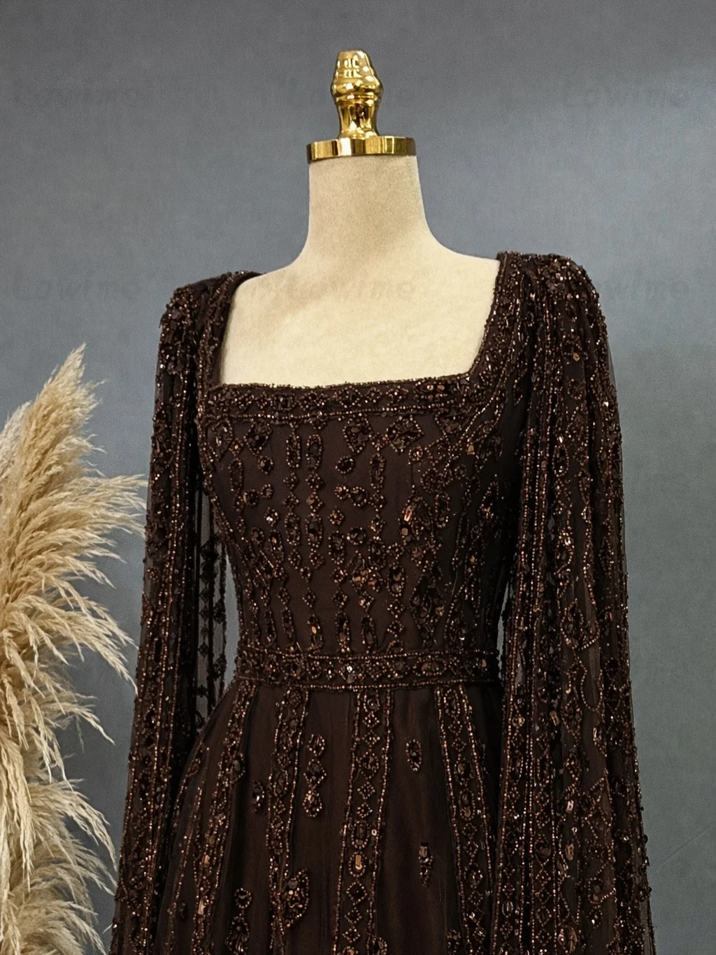 Мусульманское вечернее платье 2026 с квадратным вырезом, коричневое, для вечеринок, на заказ, А-силуэт, расшитое бисером, в арабском стиле Ближнего Востока, выпускное платье, Robe De Soiree