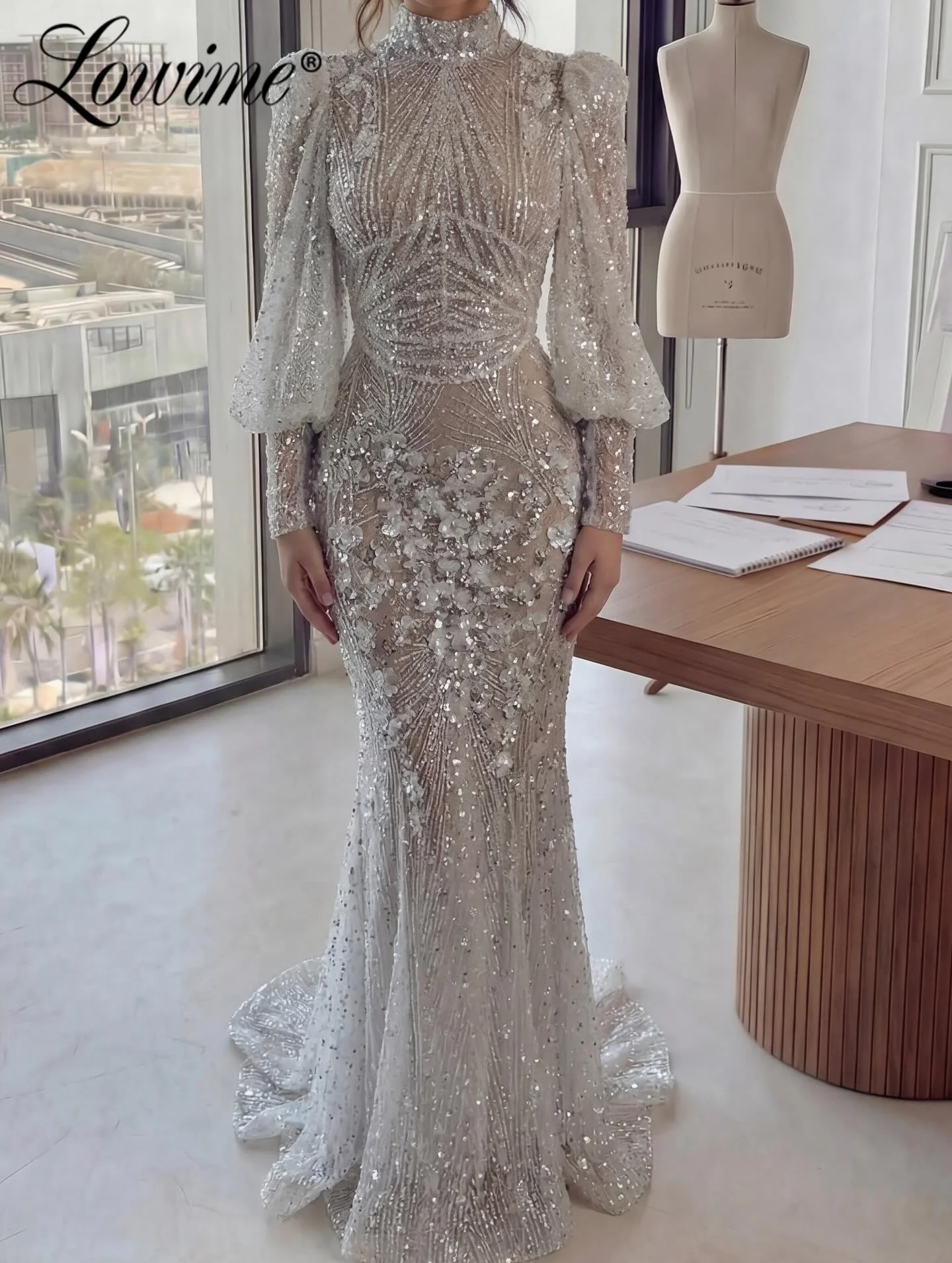 Серебряное вечернее платье «Русалка» 2026 года, на заказ, с длинными рукавами, расшитое бисером и пайетками, выпускные платья с цветами ручной работы, арабские праздничные платья