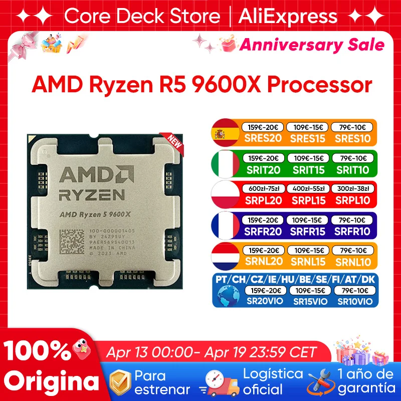 Оригинальный процессор AMD Ryzen 5 9600X, 6 ядер, 12 потоков, частота 3.9 ГГц, ускорение до 5.4 ГГц, 4 нм, TDP 65 Вт, сокет AM5