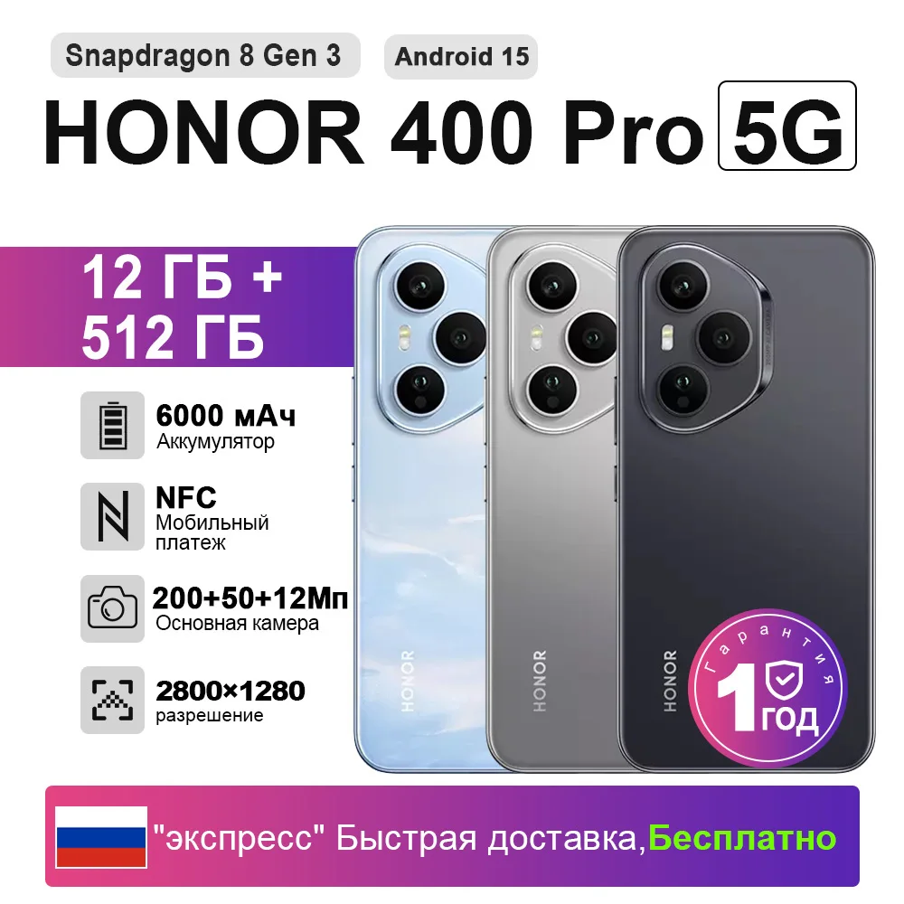 【Экспресс】Смартфон HONOR 400 Pro 5G, 12 ГБ+512 ГБ, 6.7 дюйма, 120 Гц AMOLED-дисплей, камера 200 МП, аккумулятор 6000 мАч, поддержка SuperCharge 100 Вт, eSIM