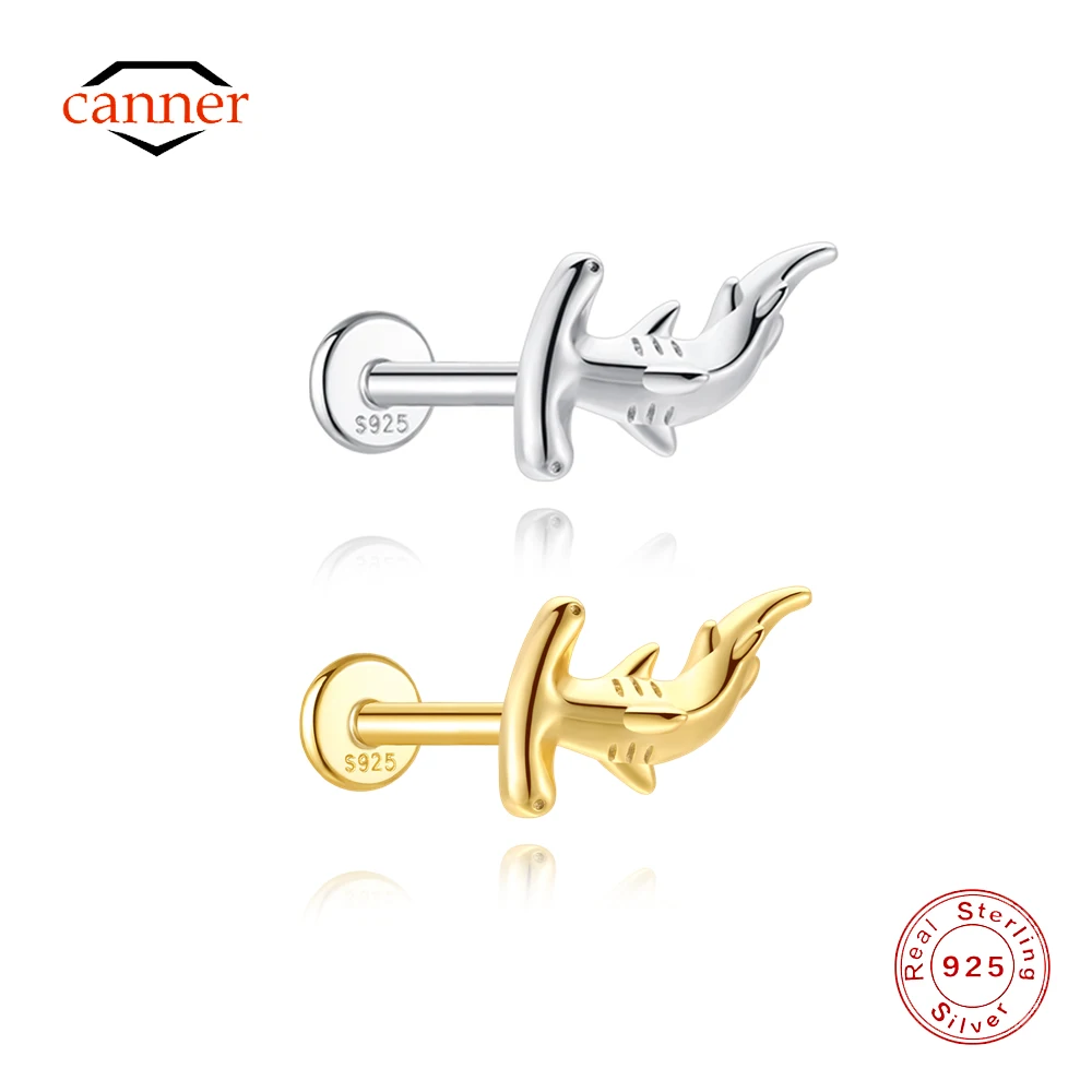 Серьга-гвоздик CANNER 1 шт. из стерлингового серебра 925 пробы с гладким дизайном в виде акулы-головоломки, с плоской задней частью, для пирсинга уха, для женщин, с покрытием из 18-каратного золота