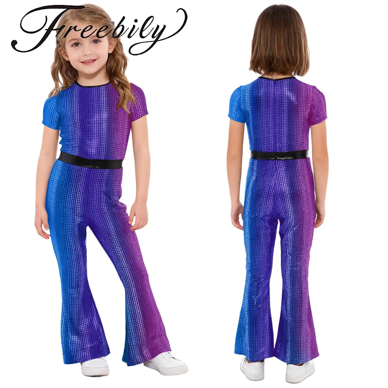 Детский комбинезон для джазовых танцев для девочек, молния сзади, расклешенный низ, металлический клетчатый купальник для всего тела, винтажный карнавальный костюм в стиле диско-хиппи 80-х годов