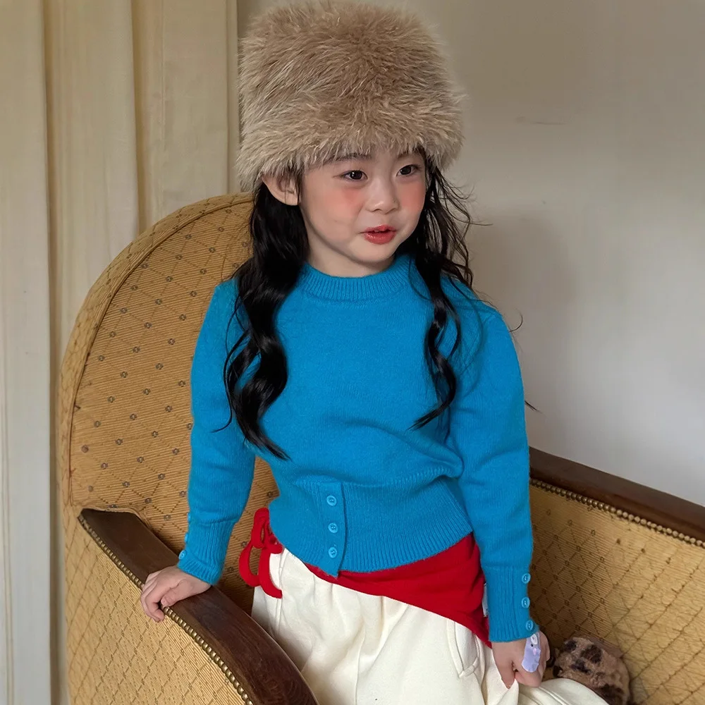 Свитер для девочек 2025 г., новая зимняя коллекция, трехцветная толстовка с длинными рукавами и круглым вырезом на талии, милая и милая универсальная повседневная одежда