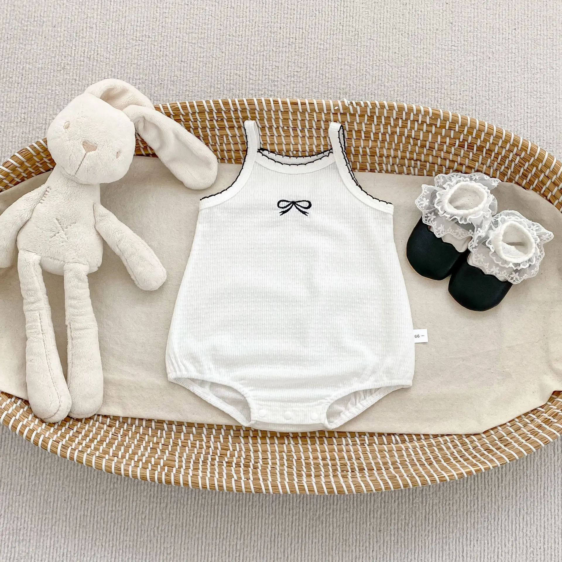 Летний новый комбинезон-боди без рукавов для девочек 2026 года, простой комбинезон с бантом, хлопковая дышащая одежда для младенцев и малышей 0-24 месяца