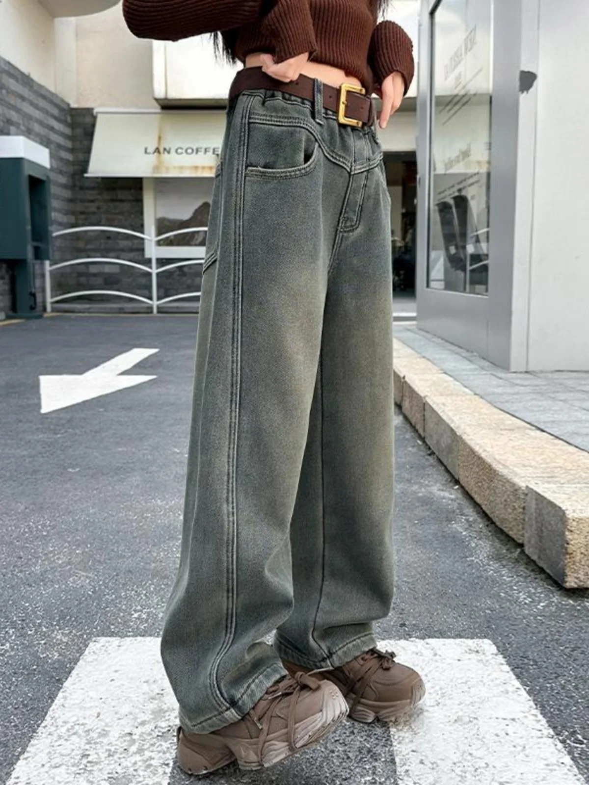 Dívčí džíny samet jaro a podzim nový kp0p dívčí přímo široká hohavice kalhot dětské kalhot