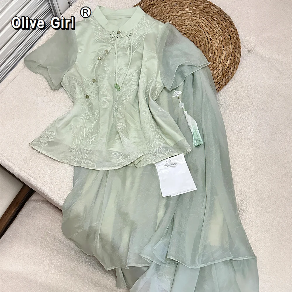 Bambus modrá knoflík nejvyšší košile blůza sukně vysoký pás dámská oblečení dvoudílná sada starobylý Čínské oblečení