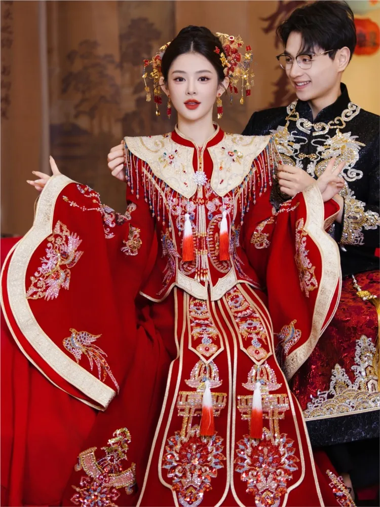 Nový samet šaty pro brides chinese-style svatební gáza toasting drak a fénix těžký ženy