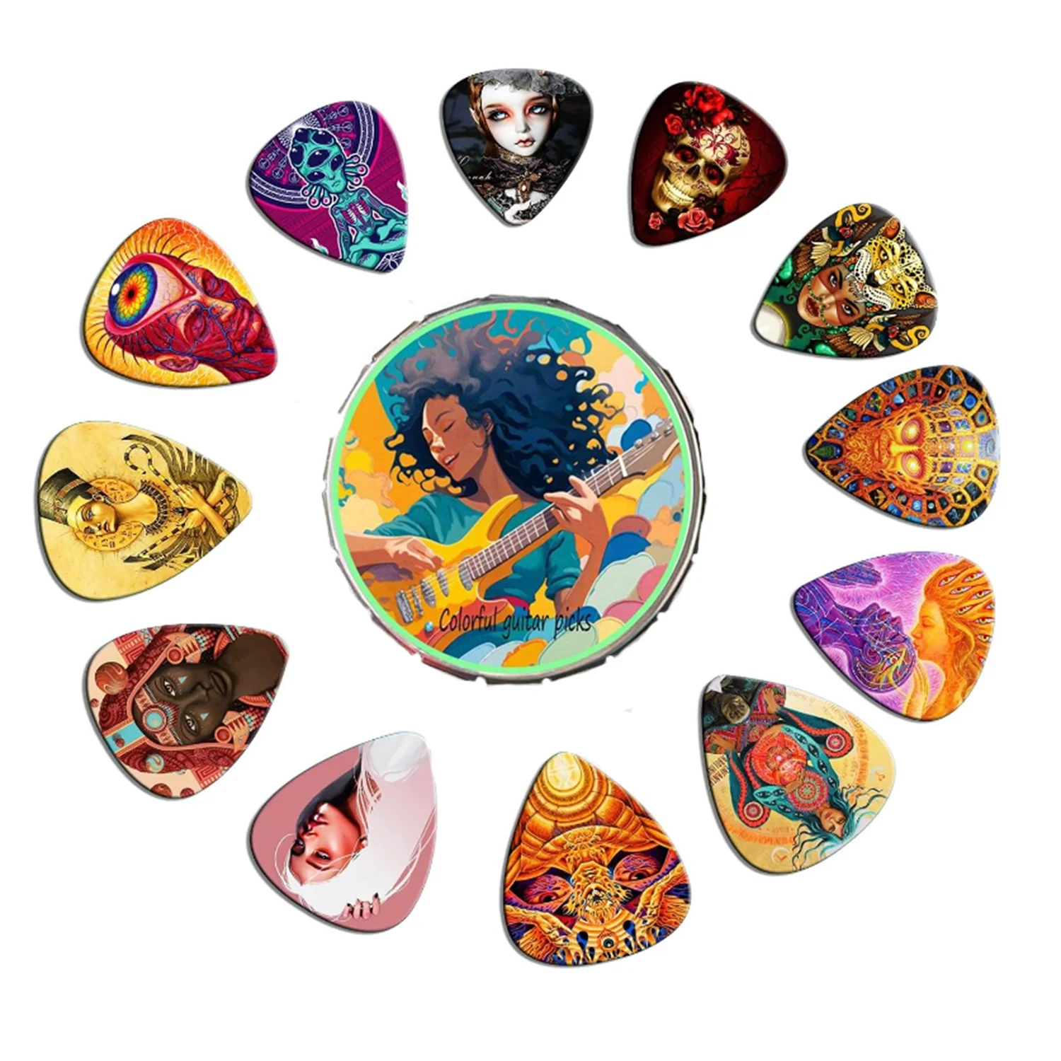 12ks číslo jednotné pestrý potištěné ABS kytara picks sada s kov skříňka odolný trsátek pro elektrický a bas kytara příslušenství gif