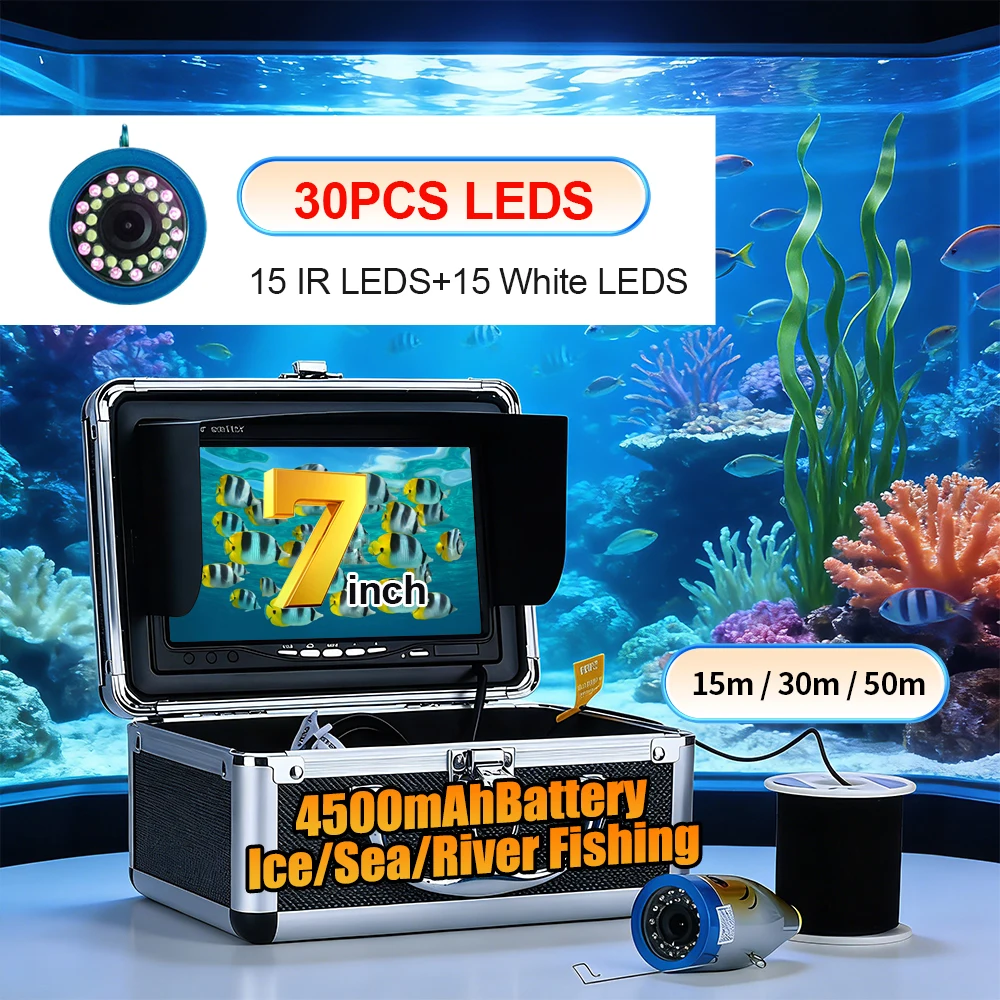 Podvodní rybaření kamera - 7" displej ryba vyhledávač, 15 bílá led diody & 15 tepelné záření lamp, 4500AH baterie pro ice/sea/river rybaření