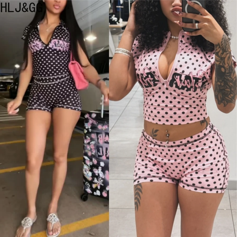 HLJ&GG móda Y2K polka tečka dopis tisk dva kusu sety ženy na zip štíhlý osvěta nejvyšší a šortky obleček retro paní 2ks pouliční oblečení