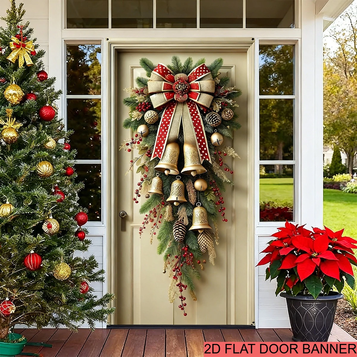 Vánoce dveře zakrýt standarta 72.03x34.65 palec s zlatý rolničkami a červená luk rustikální zima dveře prapor pro přední verandě