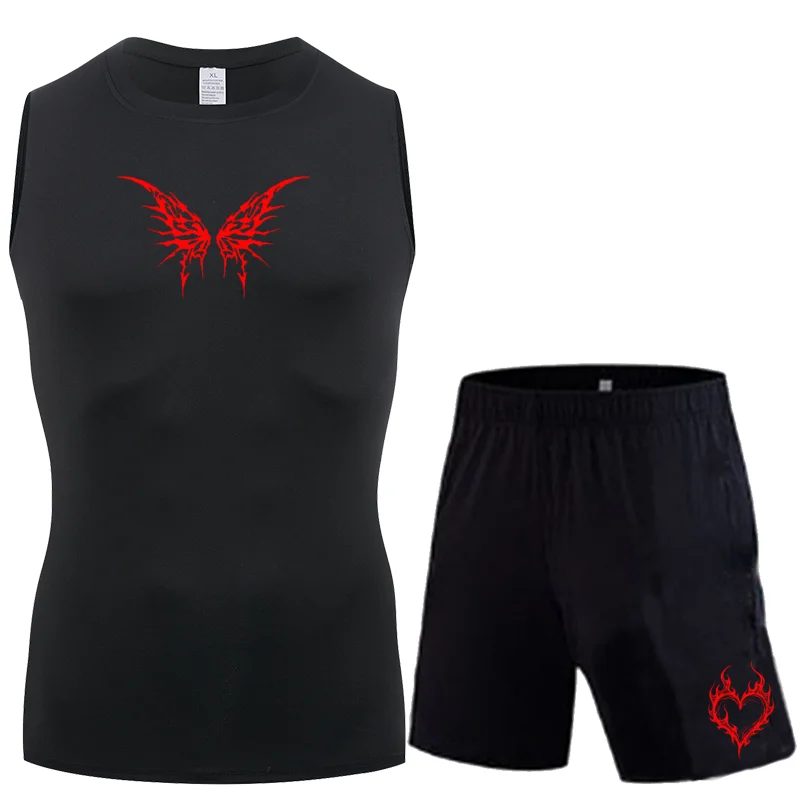 Pánské fitka cvičení rychlý suchý 2se kusu sada fitka & atletický mechanismus komprese bez rukávů košile & běžecký šortky souprava standarta grafické tisk