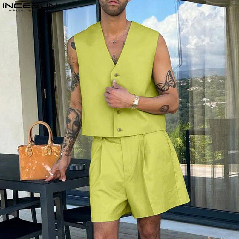 INCERUN muži sety celistvý barva V krk bez rukávů osvěta vesty & šortky dva kousky sety pouliční oblečení 2026 móda pánské ležérní obleků