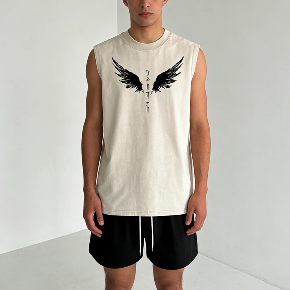 Léto pánské sepraná komora nejvyšší & atletický šortky sada retro distressed bez rukávů tričko blatník anděl křídla & textové grafické tisk