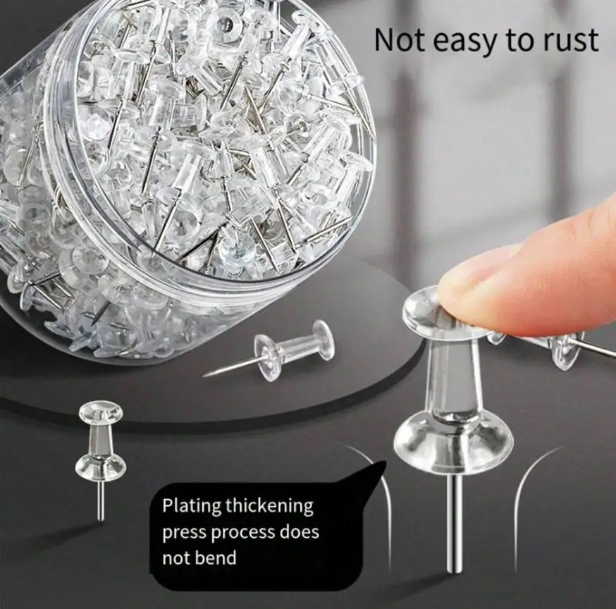 100ks průhledný strčit kolíků - plastový plochý hlava palec připínáčky s ocel bod pro bulletin korek deska, úřad, domácí, fotky, calen