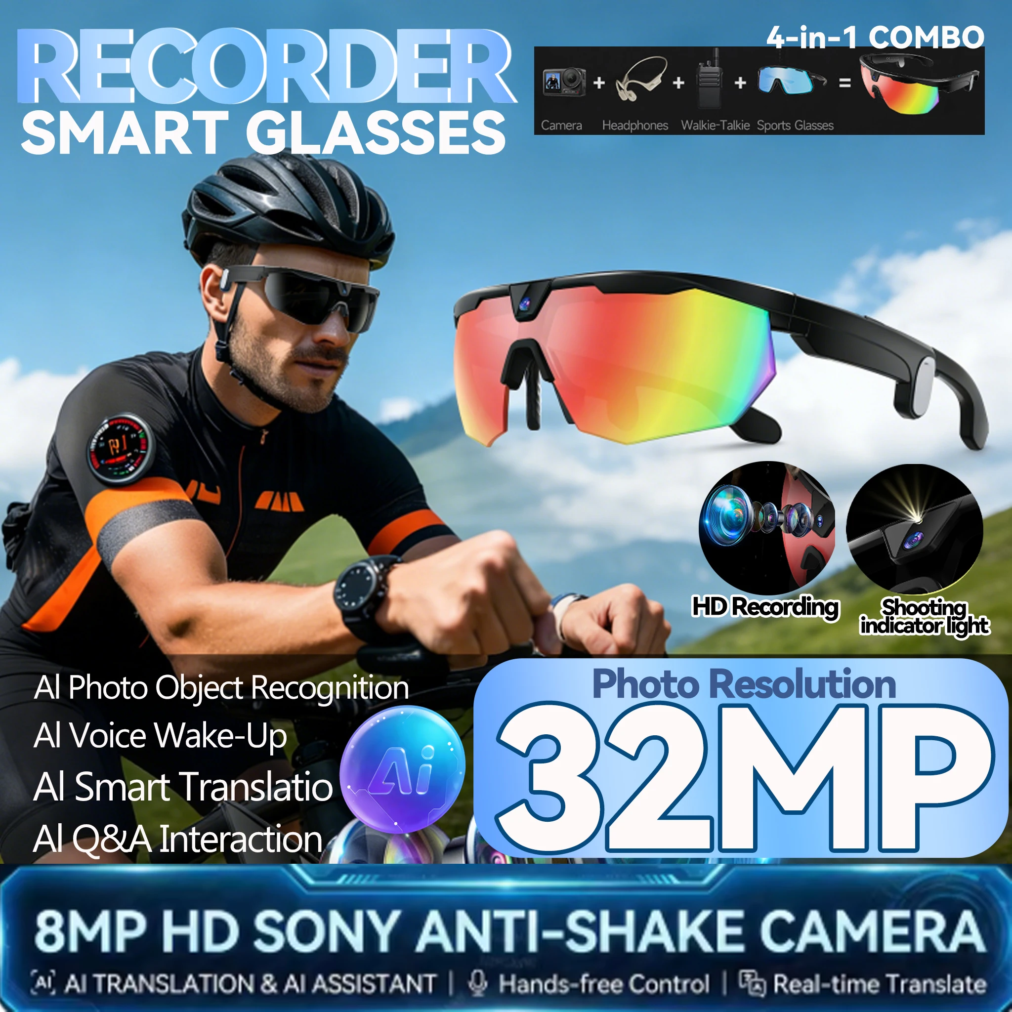 Nový AI chytrý shooting&recording brýle s 800w kamera, hd anti-shake bicykl jízdní výstřel artefakt, větruodolná ochranné brýle 2026