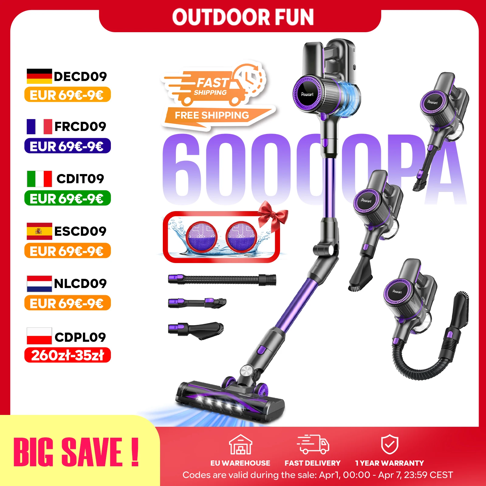 Proscenic P15 akumulátorové tyčinka vacuum čistič, 50kpa 580W sytý sání, 70min runtime, anti-tangle kartáč, 6pro vrstev filtr