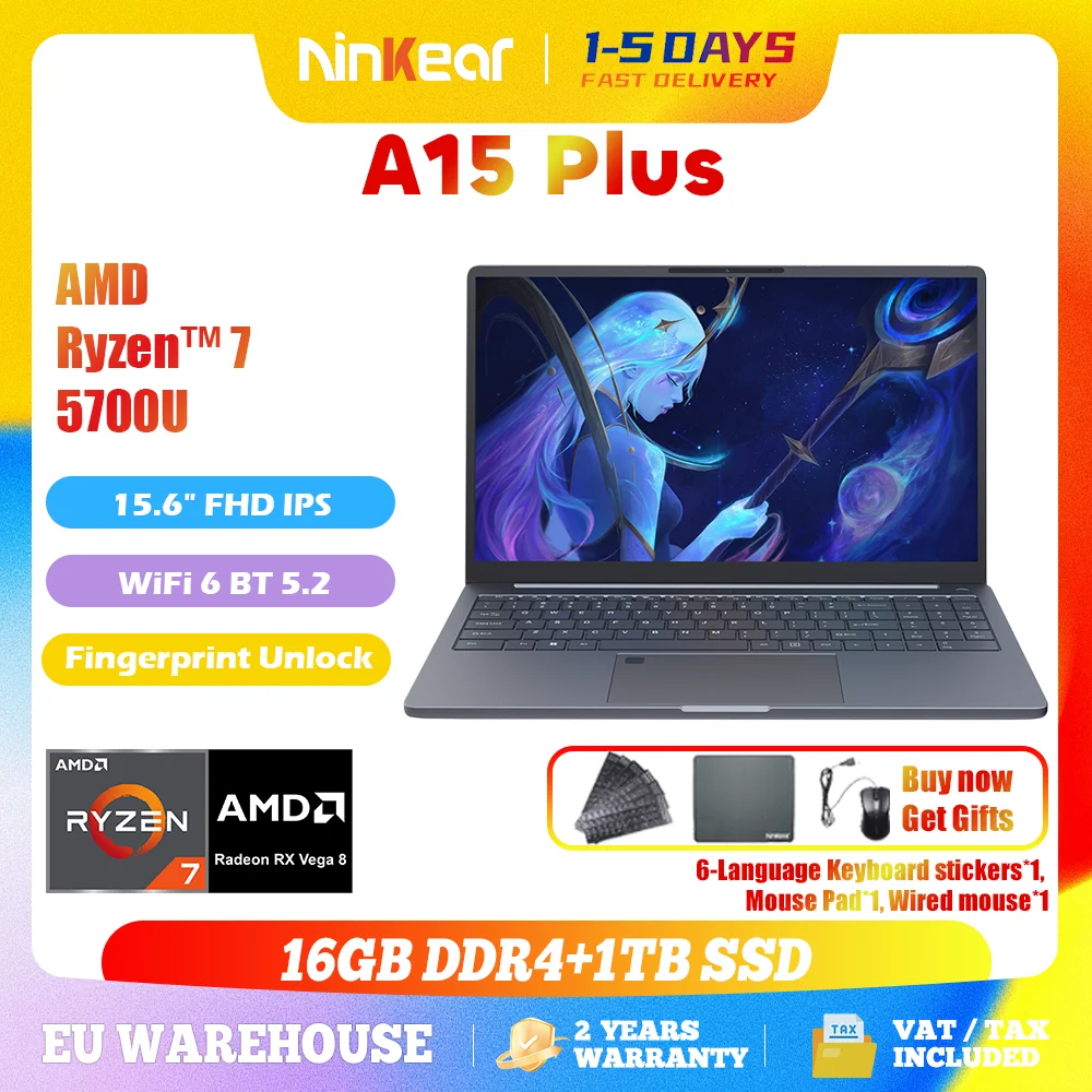 Ninkear A15 plus 2026 herní notebook computers AMD ryzen™ 7 5700U 15.6' FHD IPS 16gb DDR4 + 1TB SSD podsvícená klávesnice fpřístav odemknout
