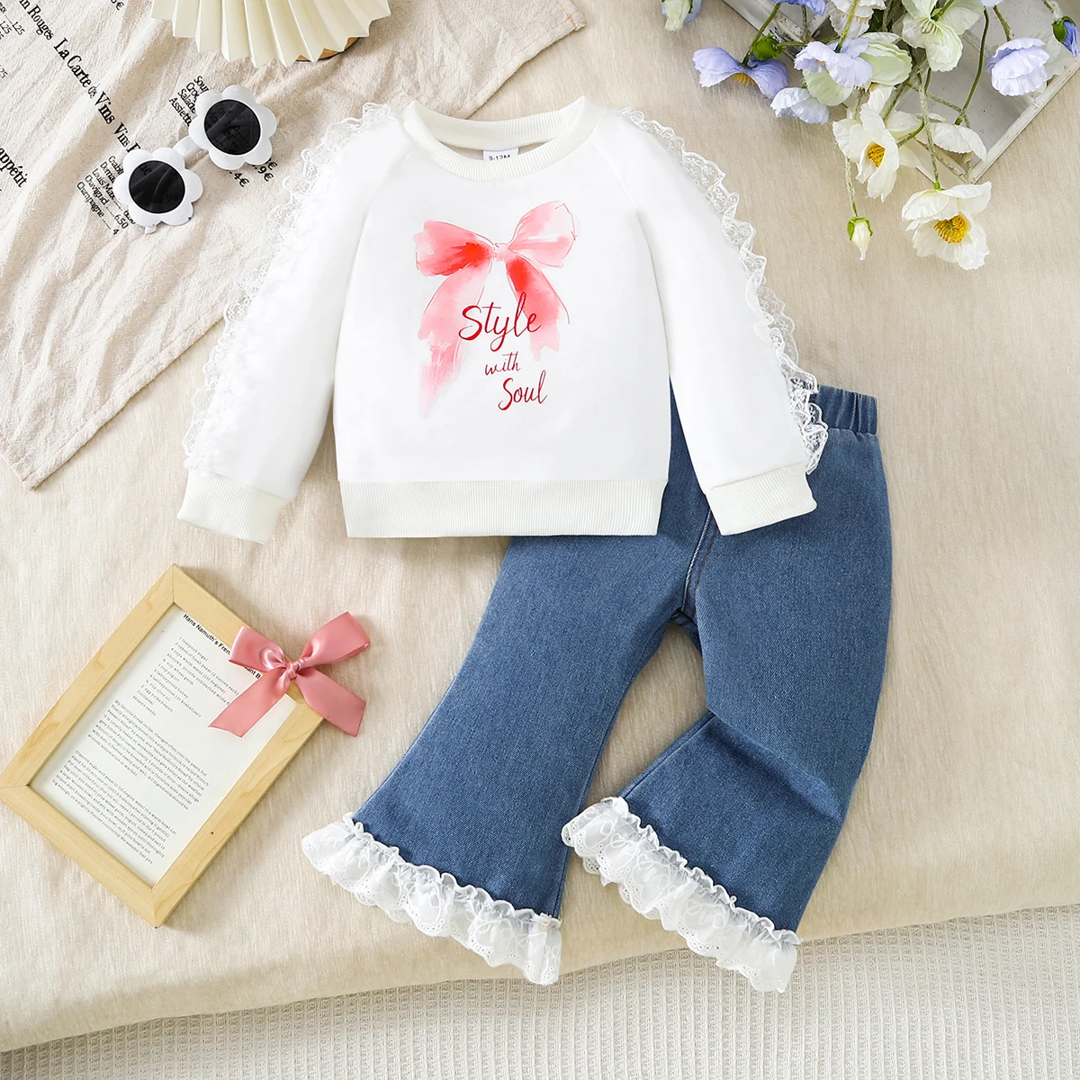 【baby girl】baby děvče mašle krajka mikina & džíny dvoudílná setthe bílá mikina funkce a měkké růžová luk paired s lett