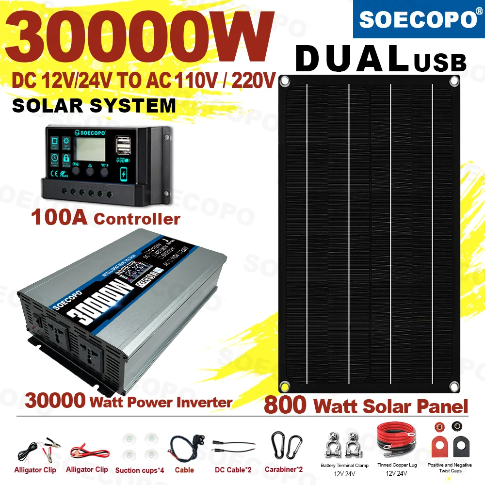 SOECOPO 30000W přenosné solární systém souprava 800w panel invertor 2se sockets dvojí elektrické napětí vstupní 12V/24V 100A regulátor kemping domácí