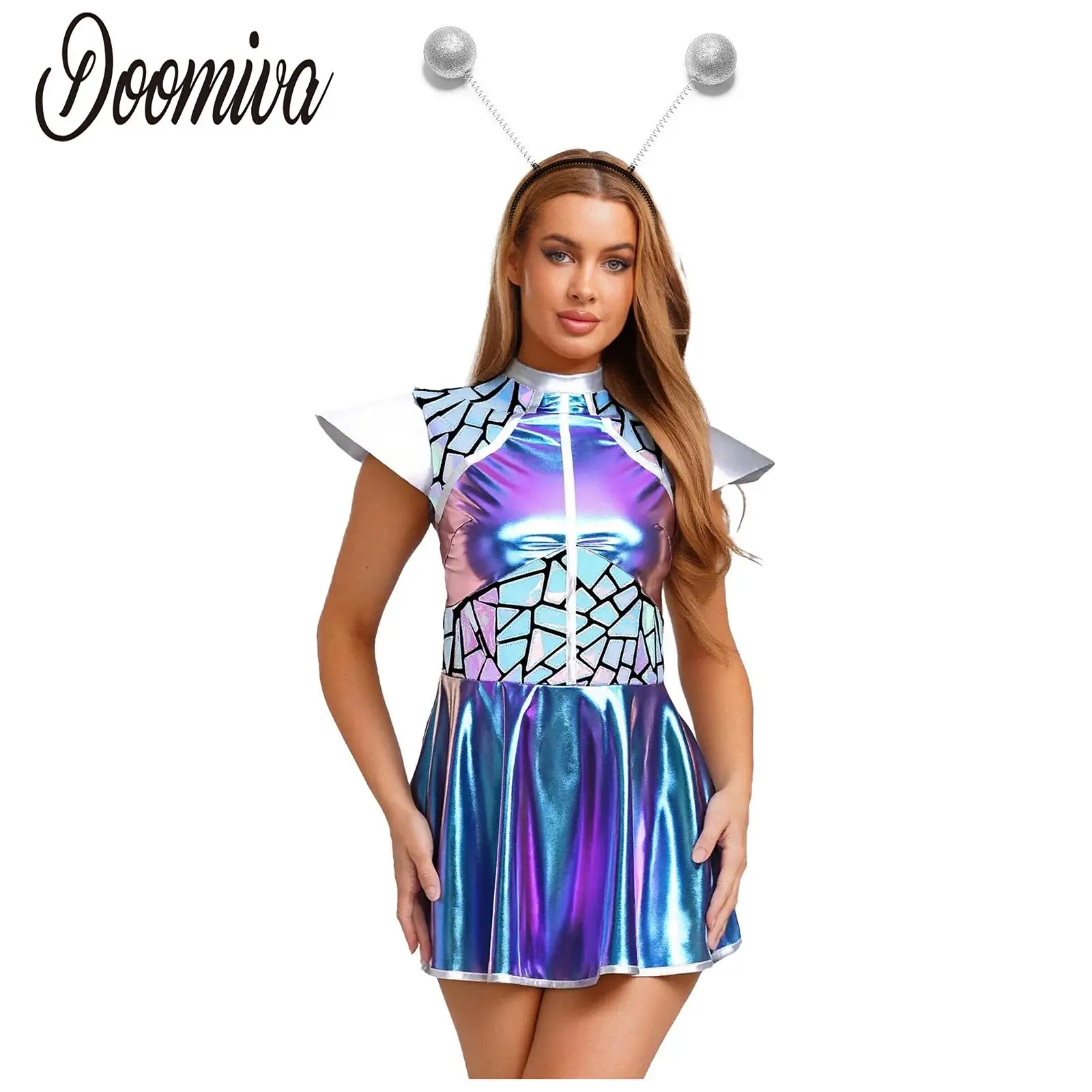 Ženy děti cizinec vlasy obruč vnější mezera legrační cizinec outerspace cosplais kostým themed večírek roleplay kostým karneval šaty nahoře