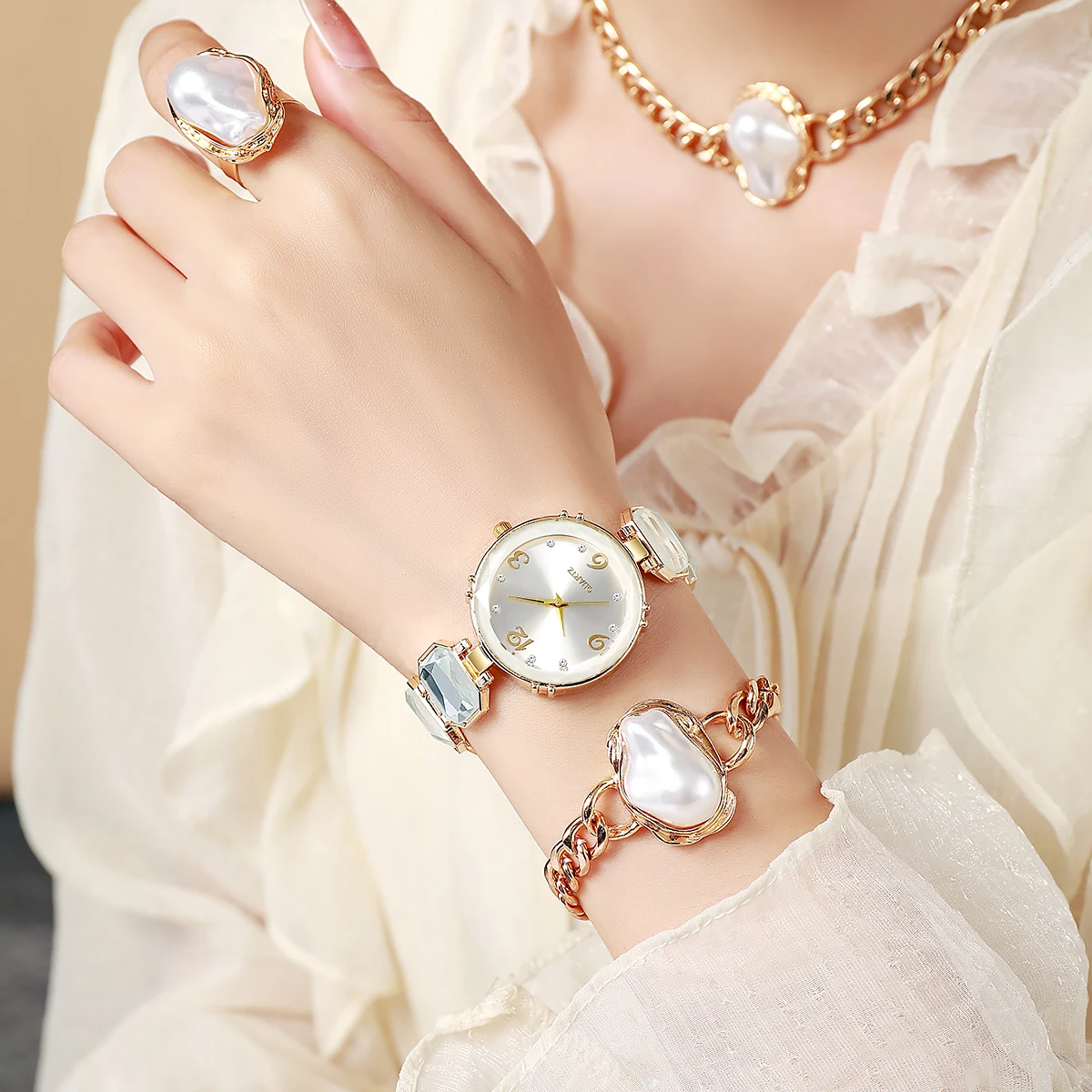Vintage cizinec perla dámská hodinky řetízek otevření prsten 6-piece sada lehký luxusní elegantní všestranné vánoce narozeniny dar