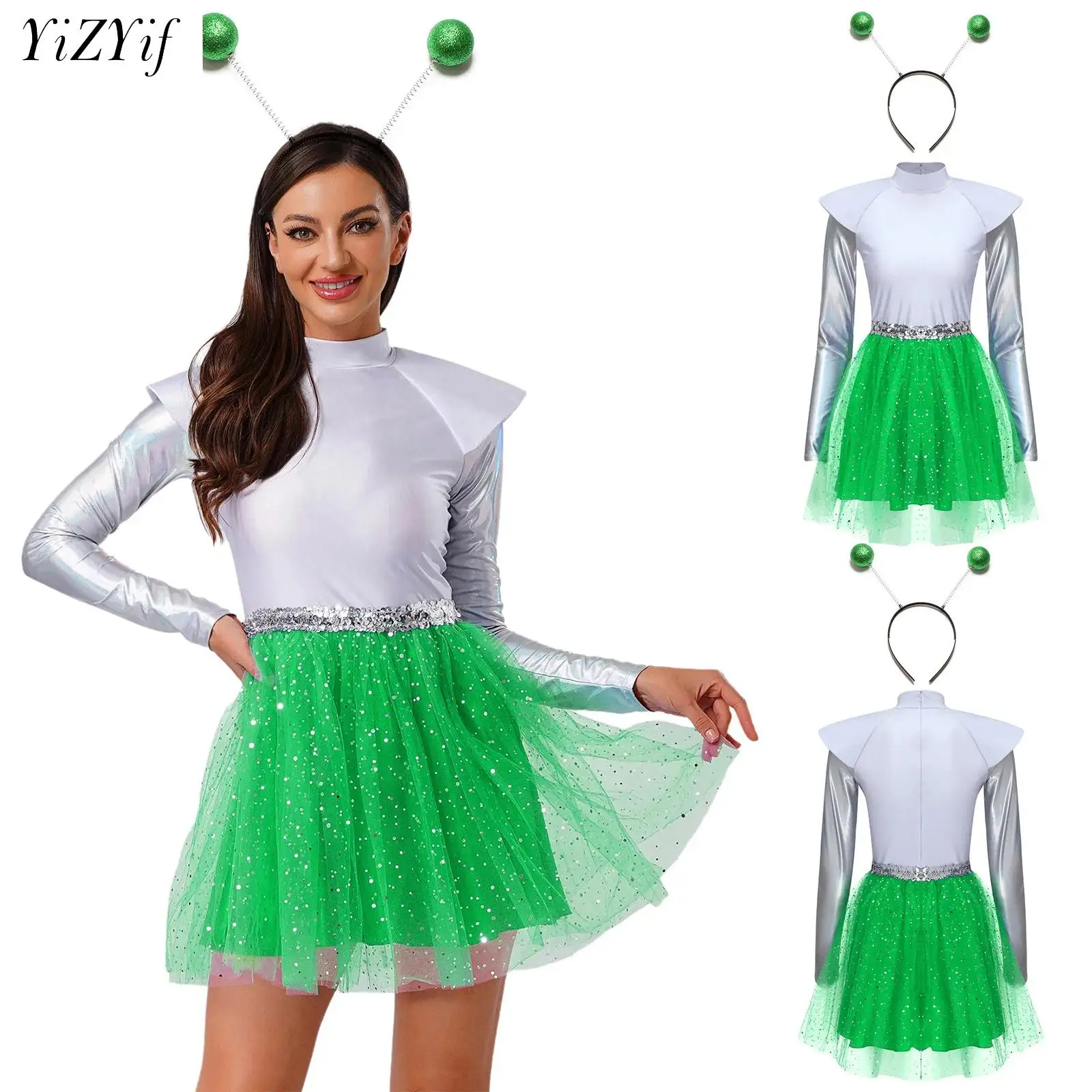 Ženy cizinec robot kostým metalické lesklý flitr tyl šaty s headwear pro halloween mezera bázeň večírek galaxy bojovnice cosplais