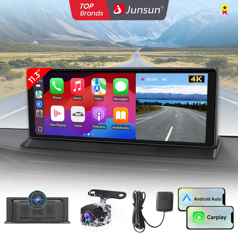 Junsun 11.3" palubní kamera 4K bezdrátový Carplay Android auto přístrojová deska obrazovka auto DVR dvojí objektiv video rekordér GPS navigace brian wayne transeau AUX