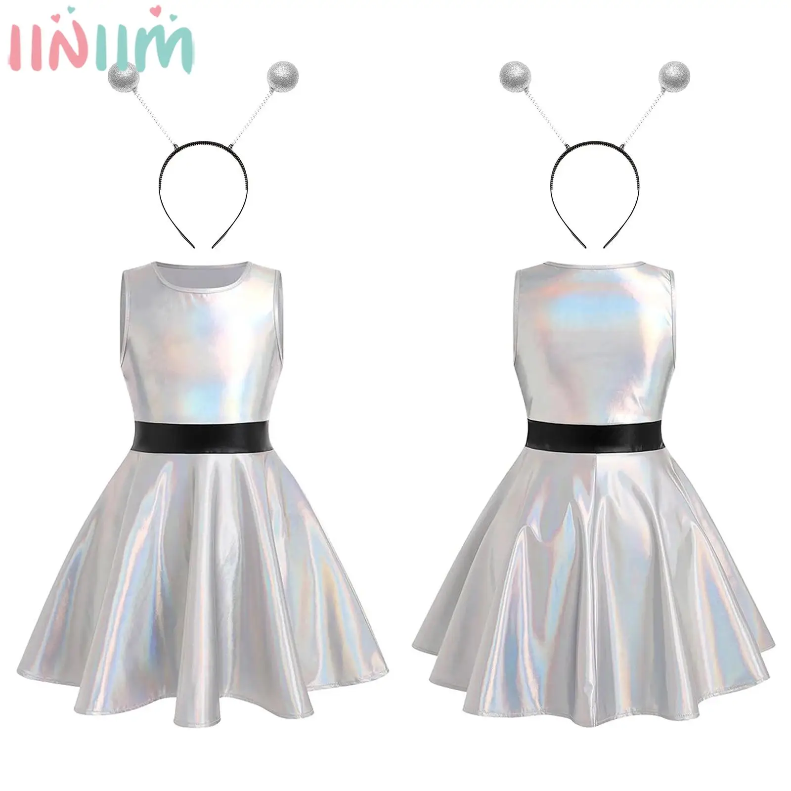 Děti dívčí halloween vnější mezera cutie cizinec cosplais kostým čepice rukáv metalické lesklý šaty s vlasy obruč pro škola ukázat
