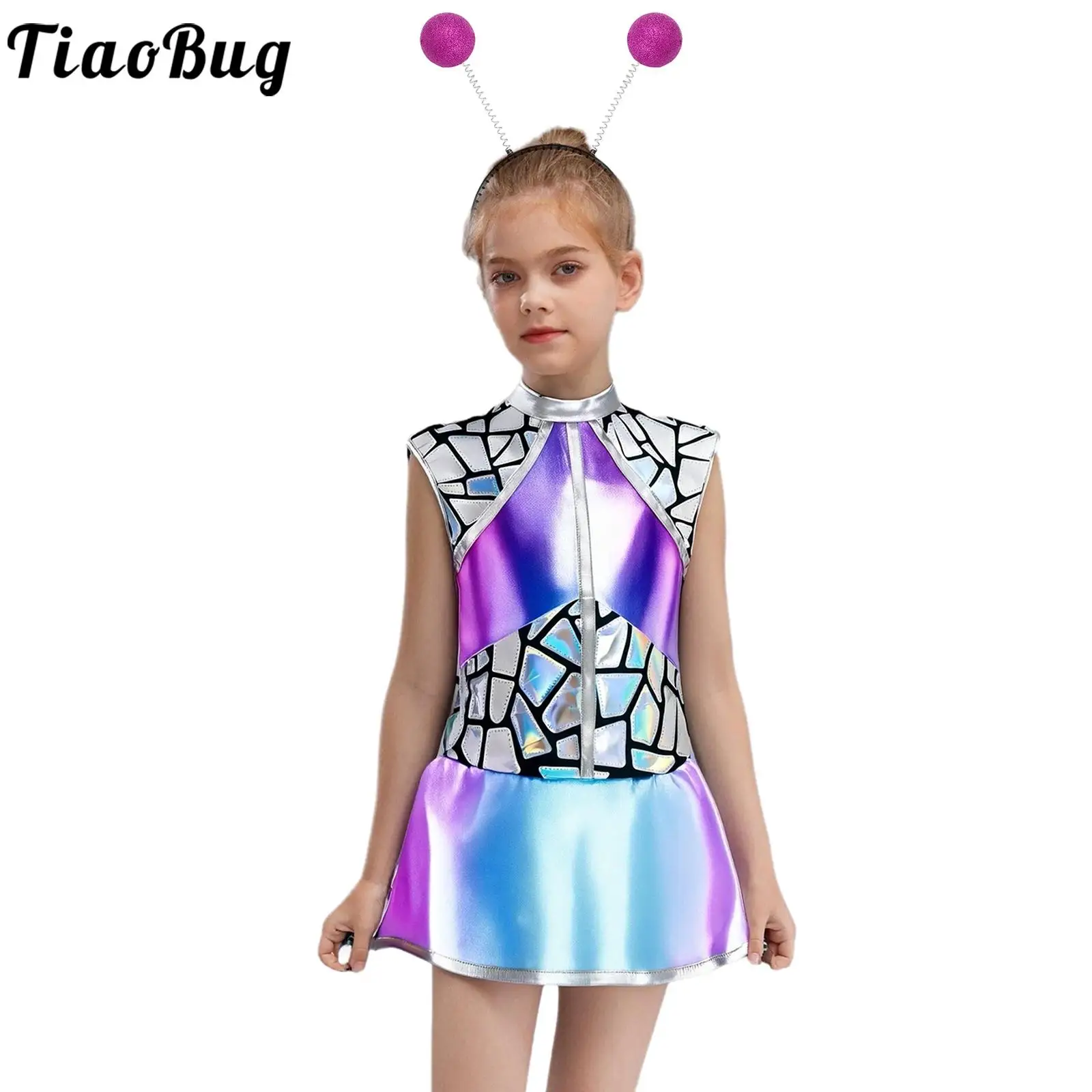 Děti dívčí halloween cizinec cosplais kostým karneval večírek outerspace cutie robot šaty nahoře lesklý metalické šaty s vlasy obruč