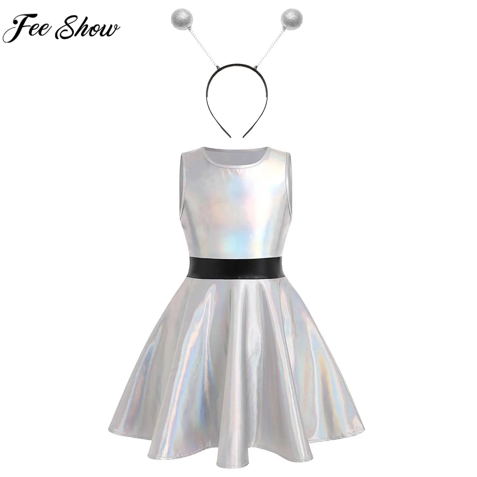 Děti dívčí halloween vnější mezera cutie cizinec cosplais kostým čepice rukáv metalické lesklý šaty s vlasy obruč pro škola ukázat