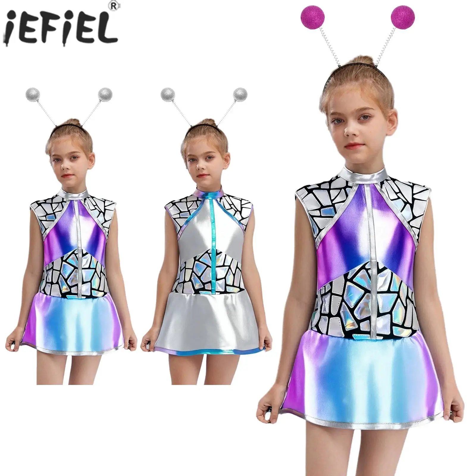 Děti dívčí halloween cizinec kosmonaut mezera robot cosplais představení kostým bez rukávů na zip metalické lesklý šaty vlasy obruč