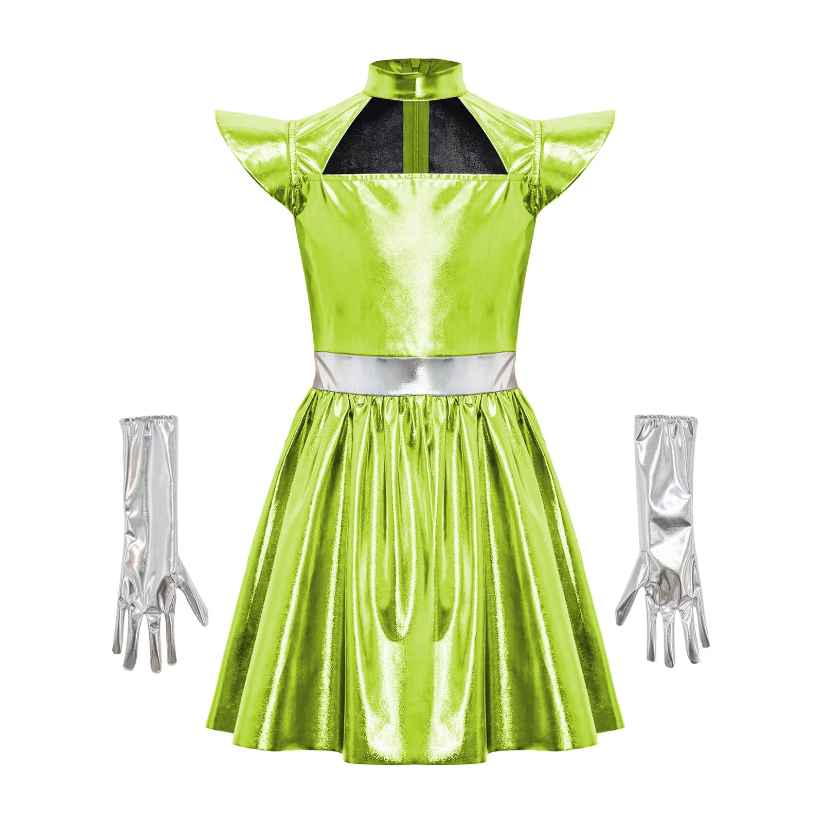 Děti dívčí halloween mezera cizinec kostým metalické lesklý na zip šaty s rukavice robot kosmonaut galaxy bojovnice dress-up oblečení