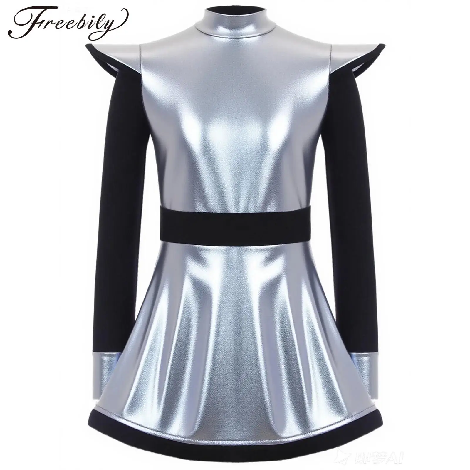 Dívčí halloween cizinec mezera bojovnice robot cosplais kostým dlouhé rukáv metalické lesklý na zip trikot šaty pro bázeň večírek