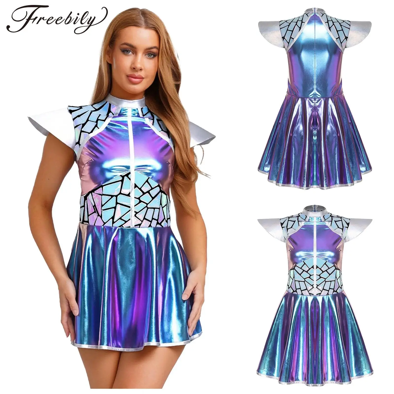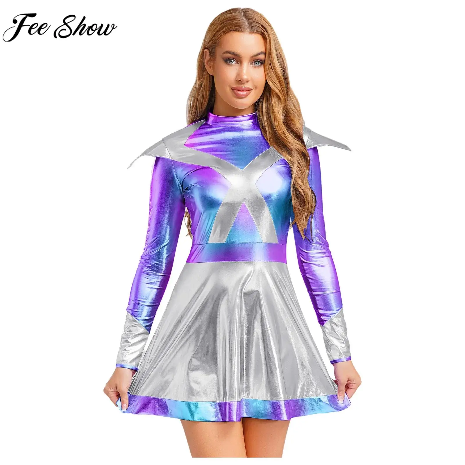 Ženy cizinec kosmonaut šaty nahoře šaty dlouhé rukáv metalické lesklý šaty mezera bojovnice cospplay šaty pro halloween karneval večírek