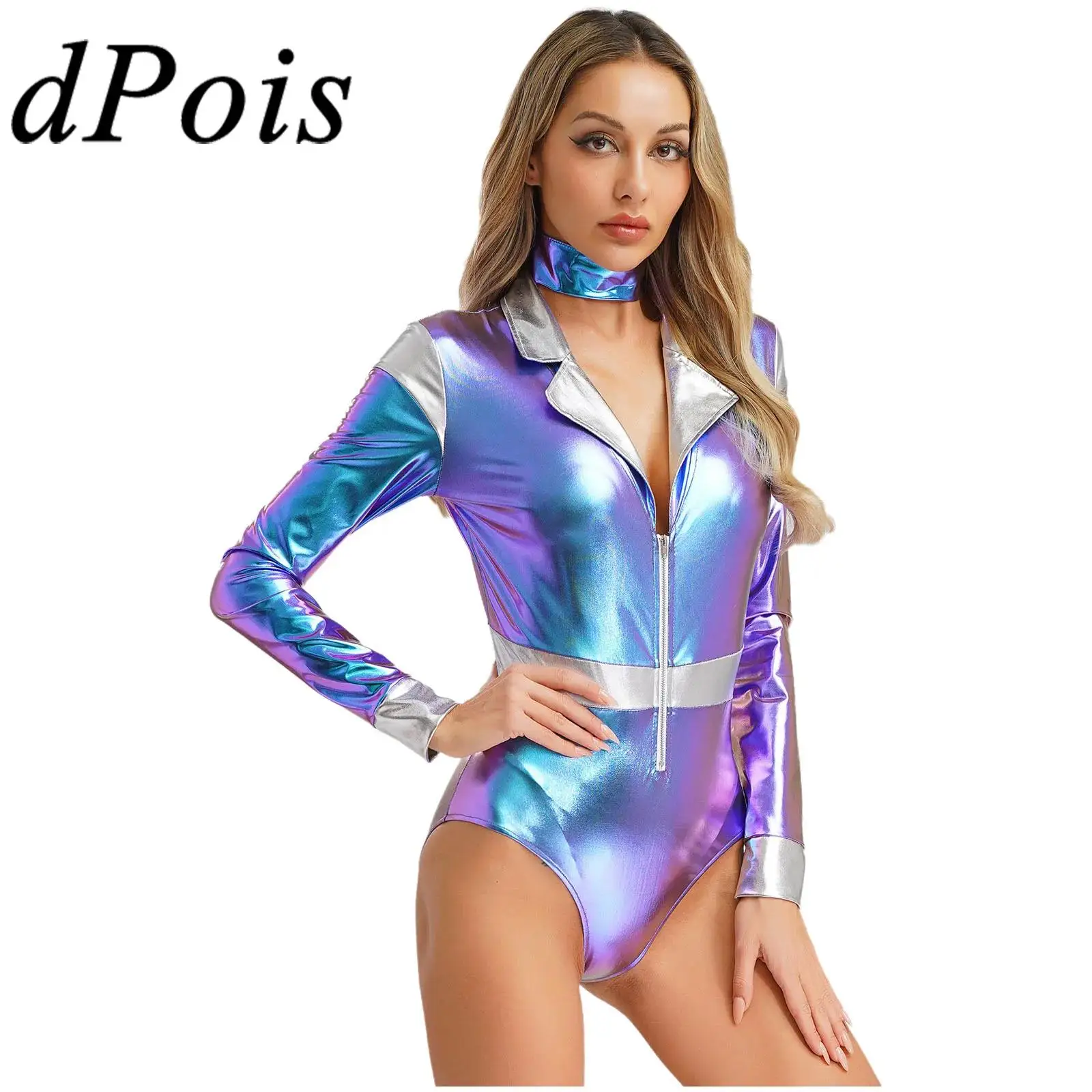 Ženy halloween cizinec mezera robot cosplais kostým dlouhé rukáv metalické lesklý kombinéza pás pro galaxy bojovnice kosmonaut šaty nahoře