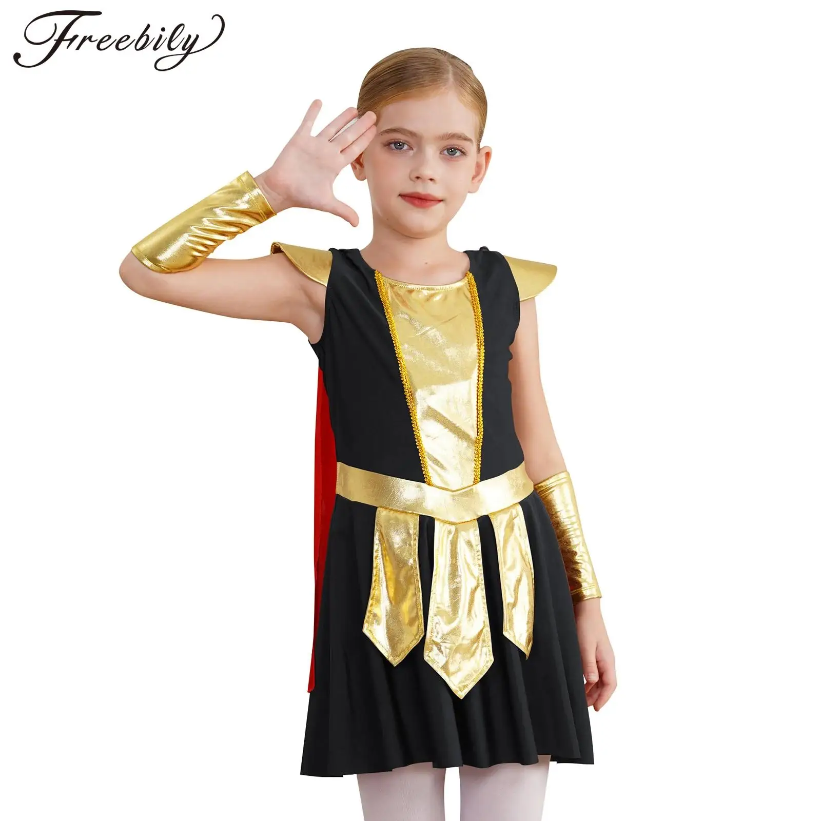 Dívčí antikové římský bojovnice cosplais kostým halloween bázeň večírek středověký voják gladiator róba metalické lesklý šaty s pelerína