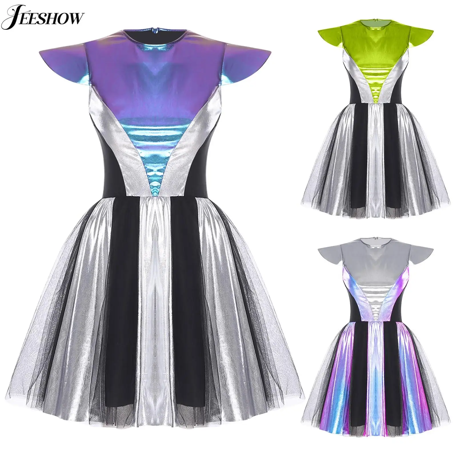 Ženy barva blok cizinec cosplais šaty galaxy cestovnà­ kostým lesklý metalické krátký rukáv nabíranou a-line šaty pro bázeň večírek