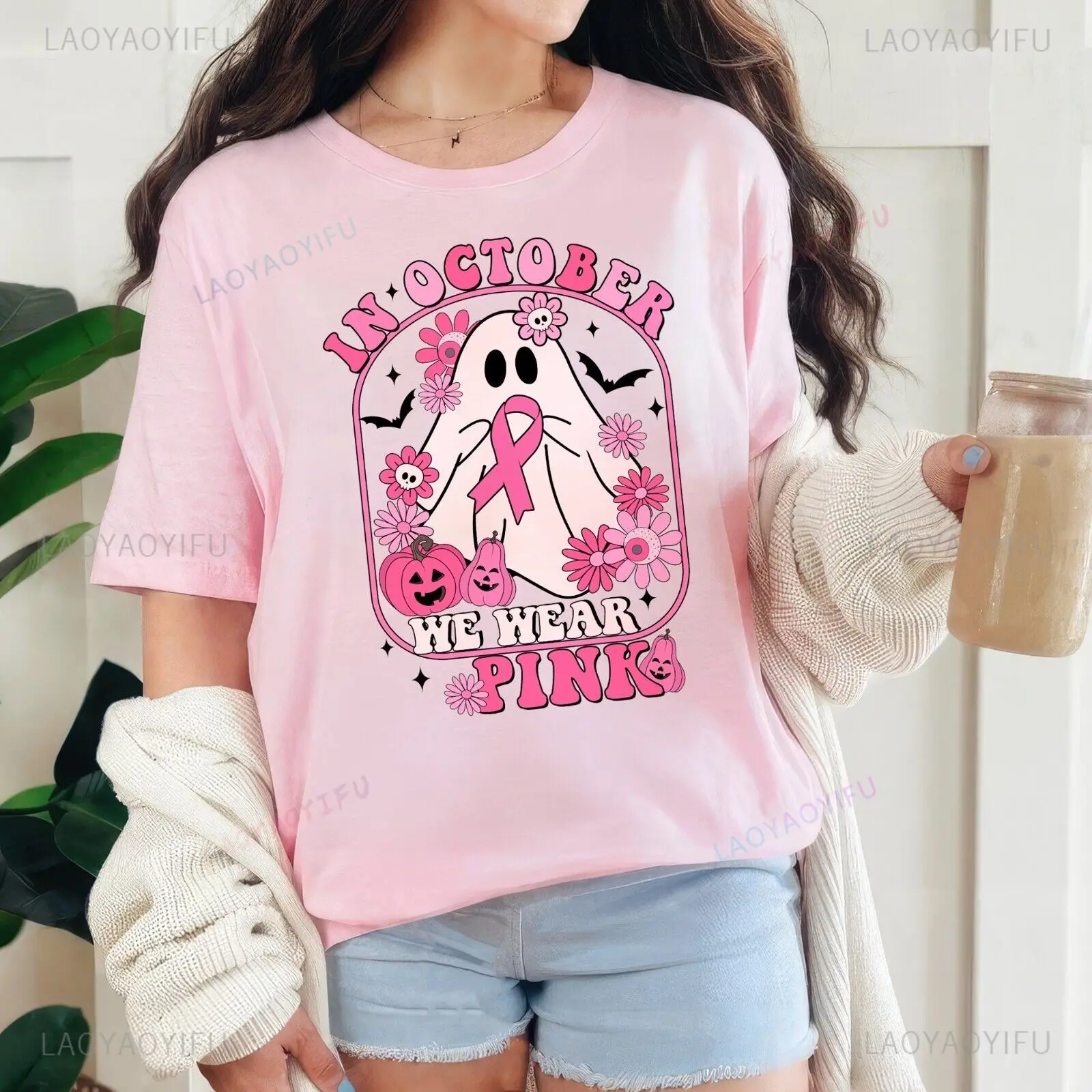 V říjen my nést růžová růžová stuha košile hruď rak bojovnice tričko květinová tričko ženy léto bavlna potištěné tričko topy