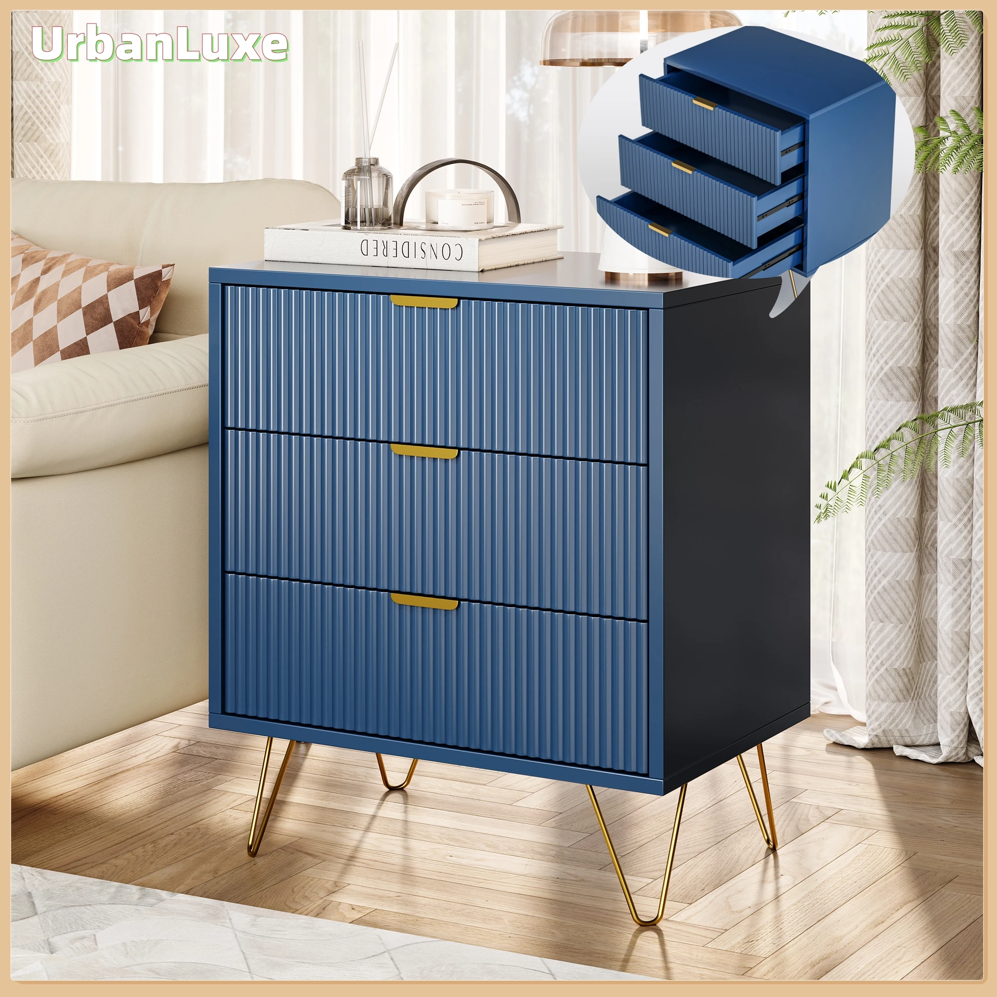 U postele stůl s 3čepel zásuvek, kov nohama a zlatý madla, moderní u postele stůl postel strana stůl ložnice u postele skříň, modrá