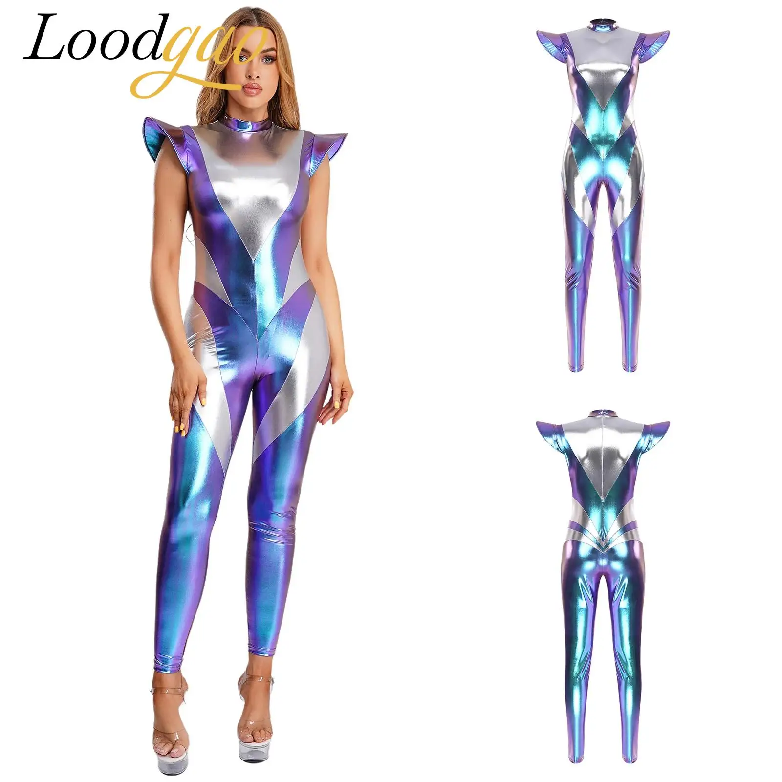 Cizinec kostým pro ženy metalické kombinéza robot kosmonaut unitard barvitý kalhot vnější mezera večírek dospělé cosplais obleček