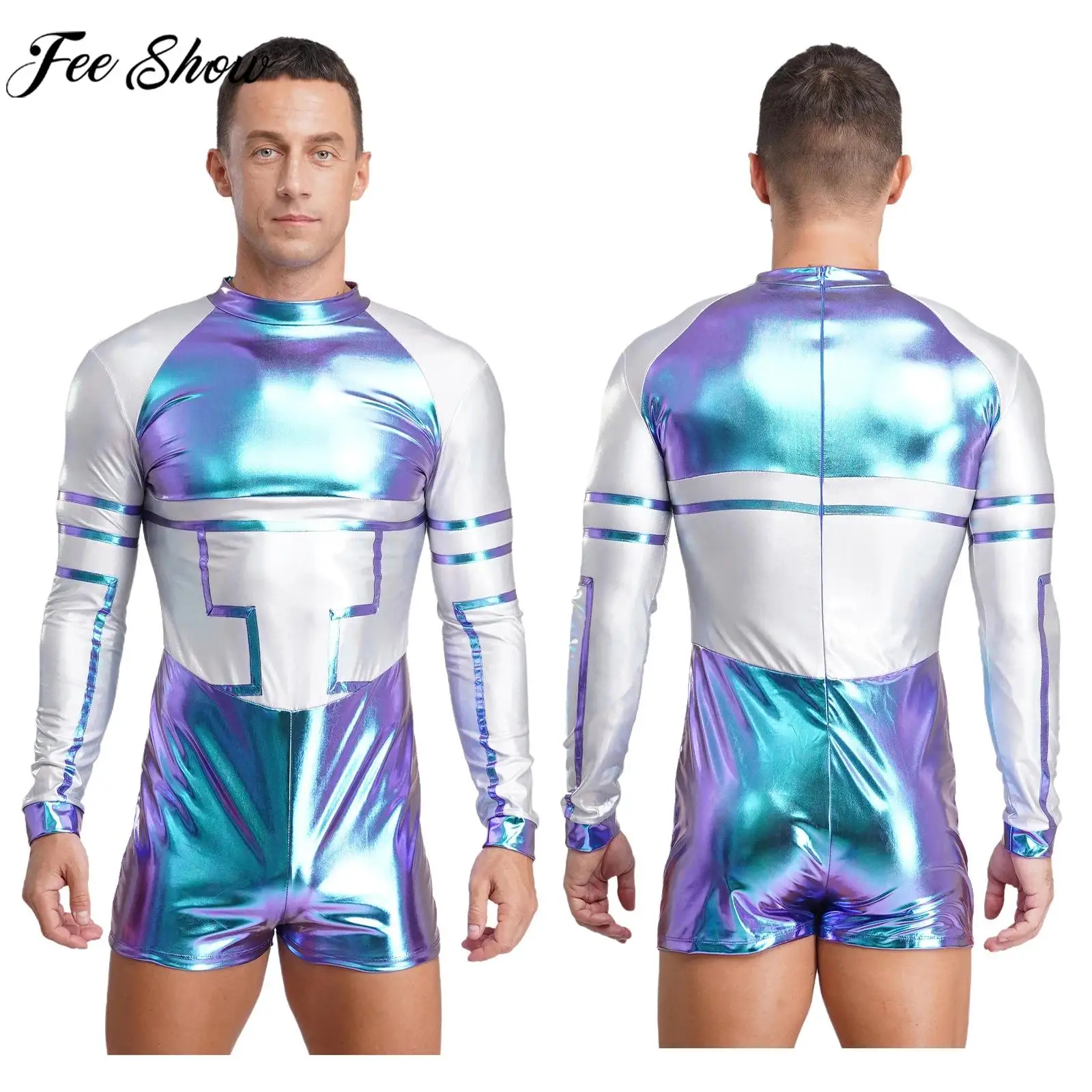 Muži halloween cizinec robot galaxy bojovnice kosmonaut cosplais kostým metalické lesklý dlouhé rukáv kombinéza pro mezera bázeň večírek