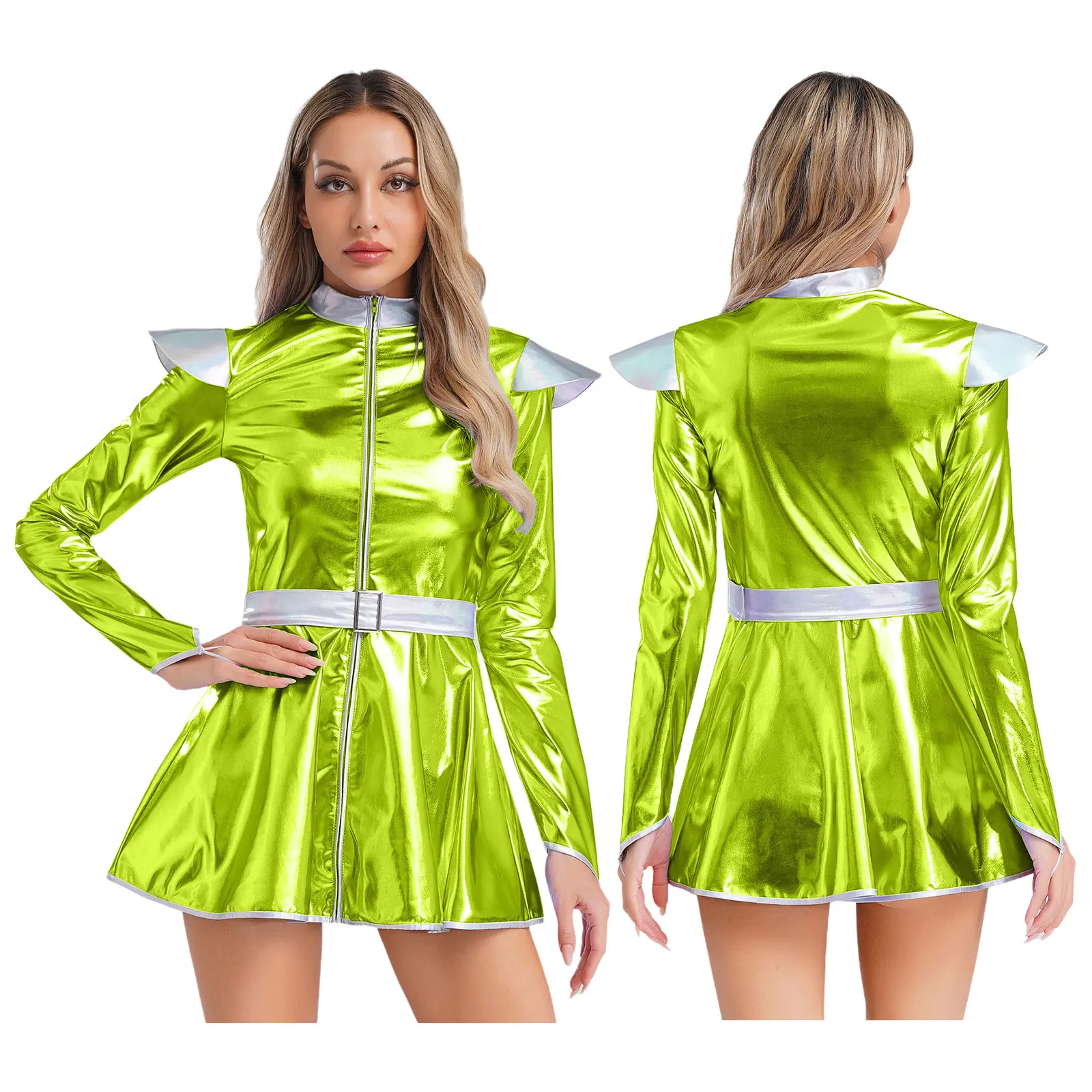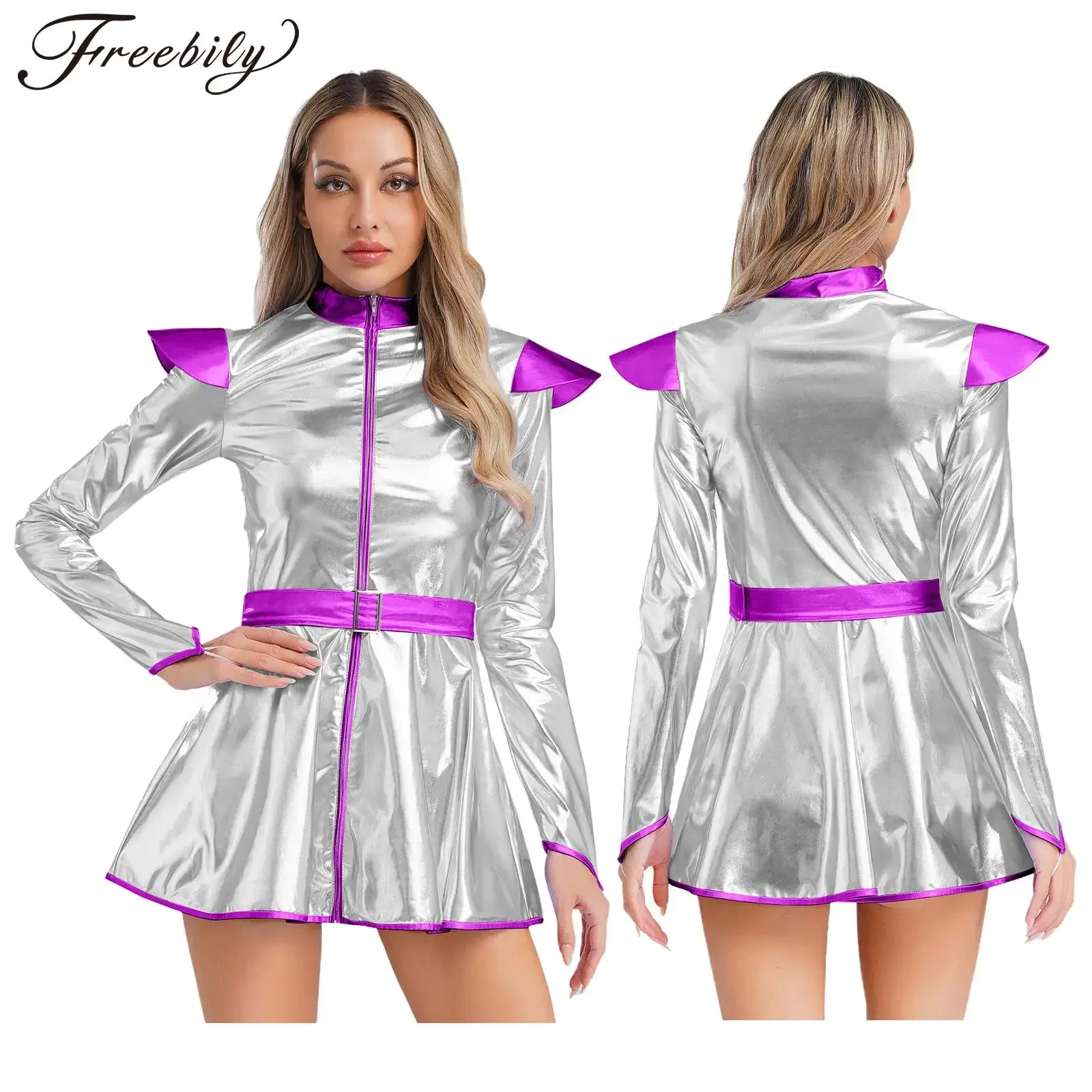 Ženy halloween cizinec galaxy bojovnice robot kosmonaut cosplais kostým dlouhé rukáv metalické lesklý vnější mezera šaty s pás
