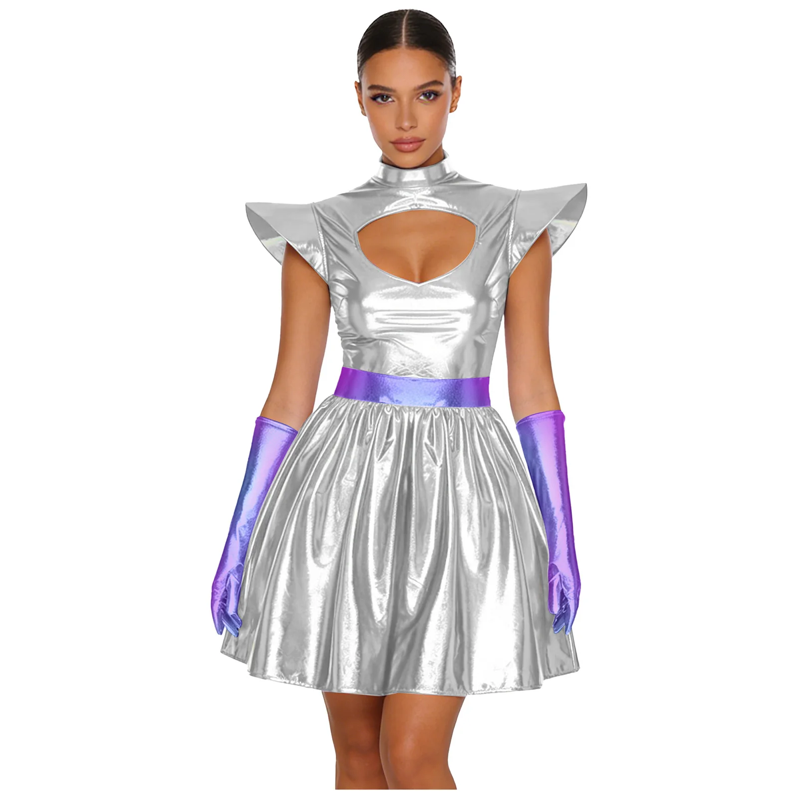 Ženy halloween bázeň večírek mezera cizinec kosmonaut robot galaxy bojovnice cosplais kostým metalické lesklý a-line šaty s rukavice