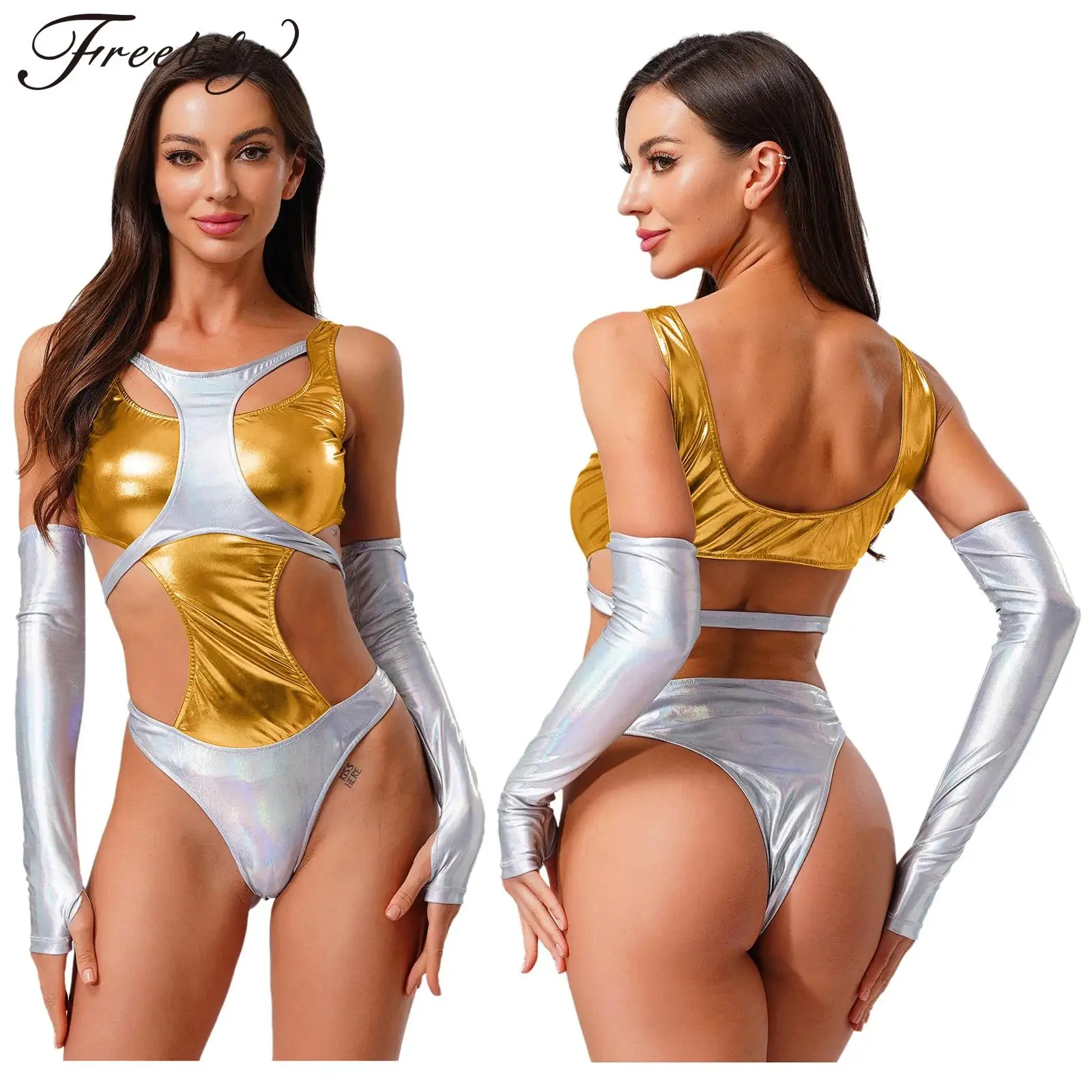 Ženy halloween cizinec kosmonaut vnější mezera bojovnice galaxy robot cosplais kostým metalické lesklý výřez kombinéza s rukavice