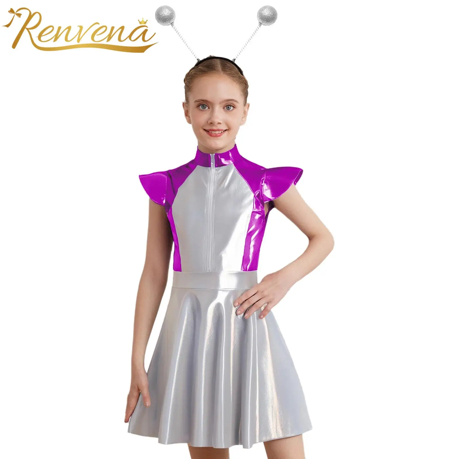 Děti dívčí halloween vnější mezera cutie cizinec cosplais kostým čepice rukáv metalické lesklý šaty s vlasy obruč pro škola ukázat