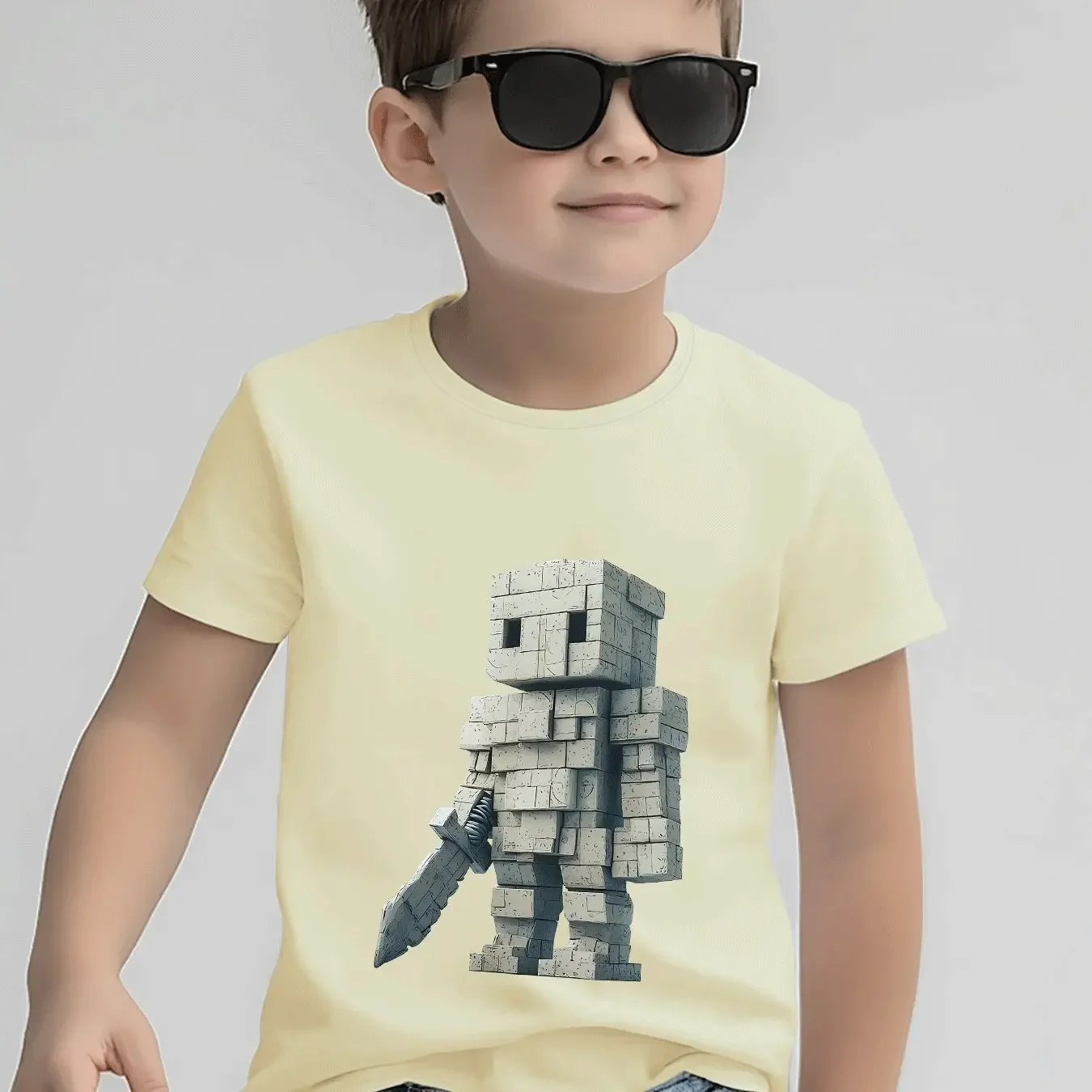 Boys' pixel bojovnice s meč tisk krátký rukáv tričko - šedá kámen blok povaha požitek grafické bavlna tričko