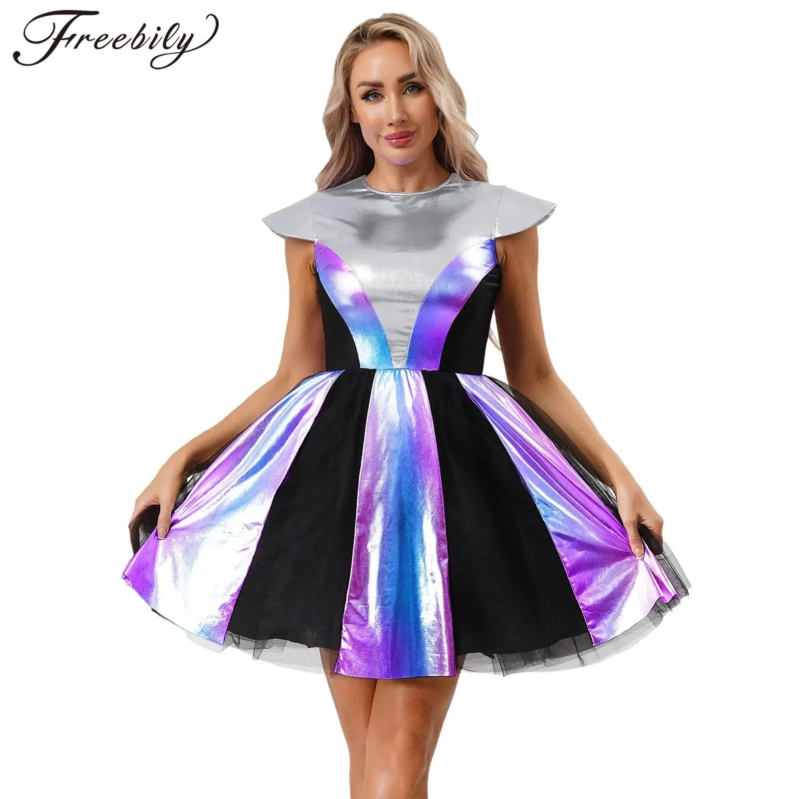 Dívčí halloween karneval cizinec robot kosmonaut galaxy bojovnice cosplais kostým metalické lesklý na zip vnější mezera cutie tutu šaty