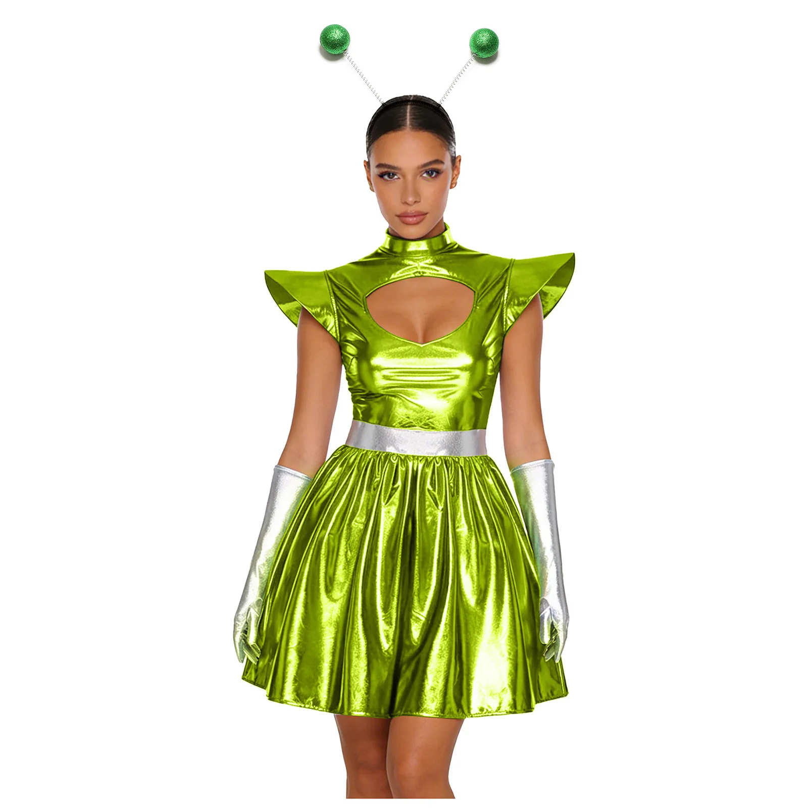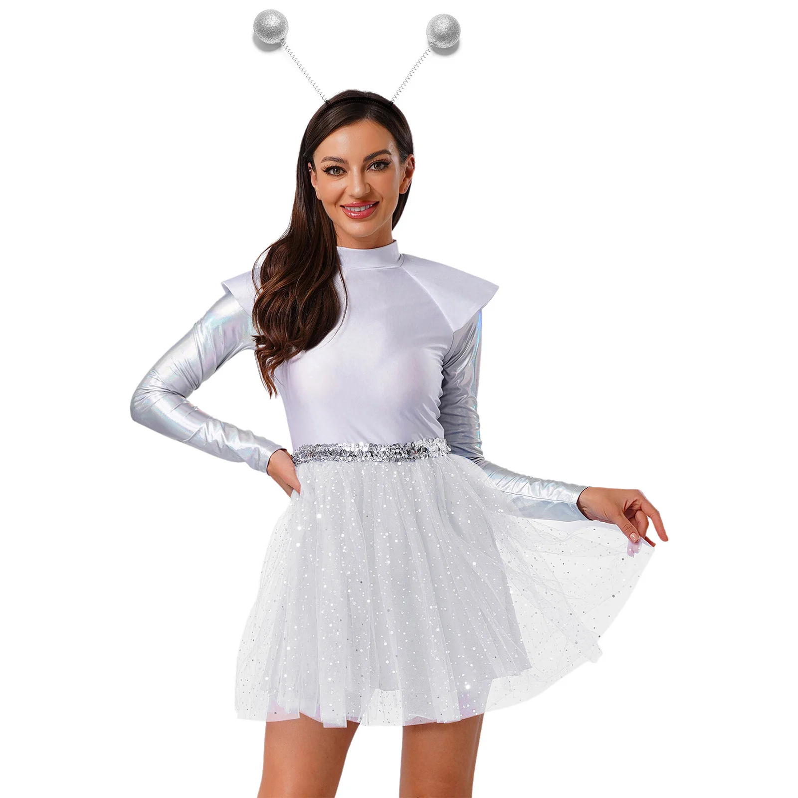 Ženy metalické lesklý flitr tyl cizinec šaty s headwear halloween mezera bázeň večírek robot galaxy bojovnice cosplais kostým
